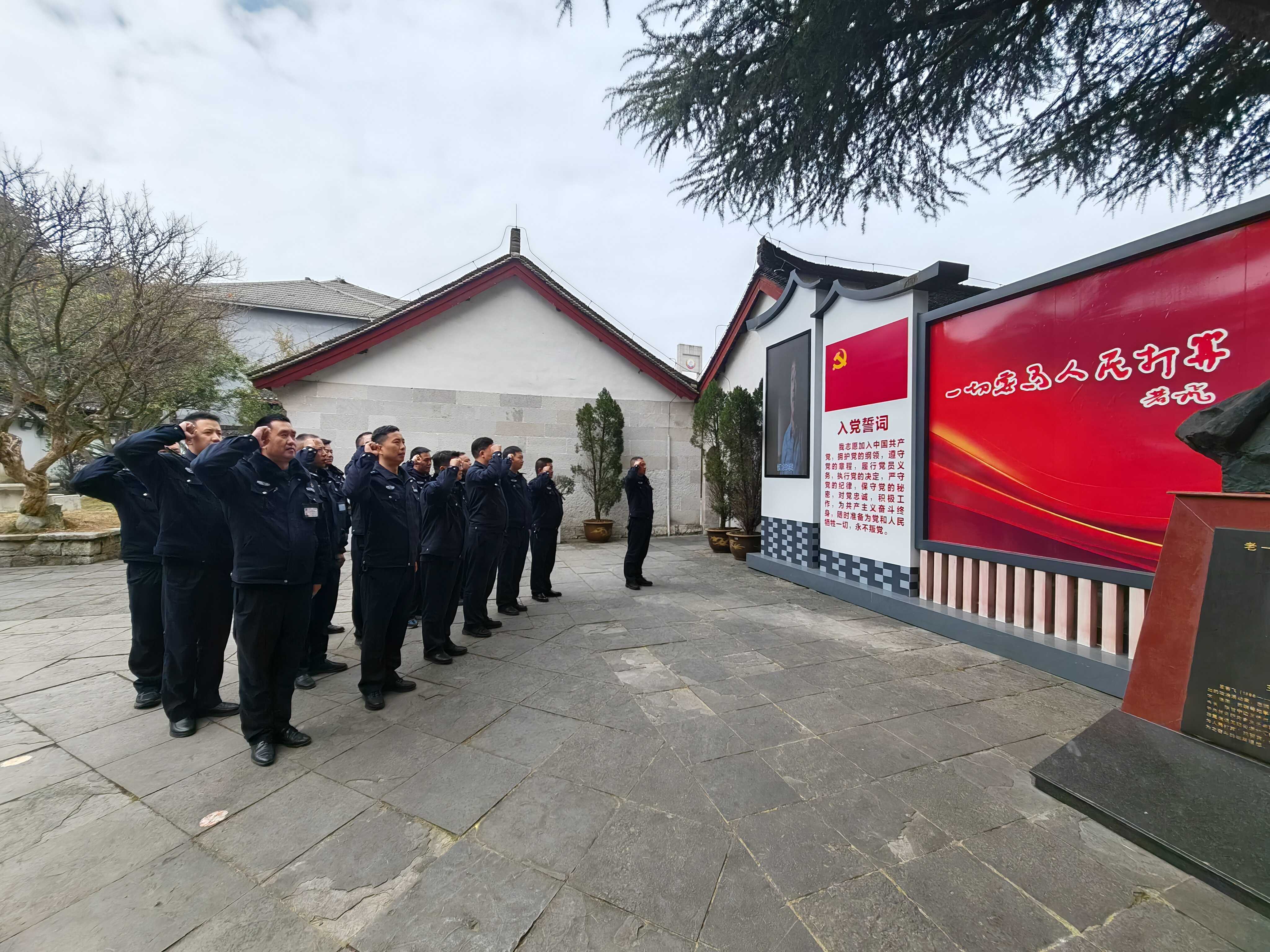 参观结束后,全体民警在王若飞同志铜像前重温入党誓词,在王若飞故居陈列馆前合影留念。