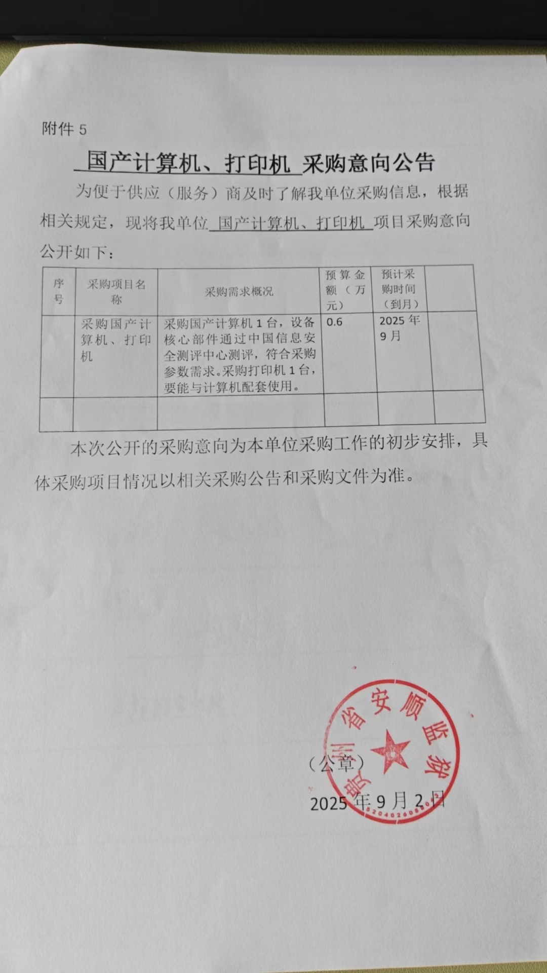 贵州省安顺监狱采购国产计算机、打印机意向公告