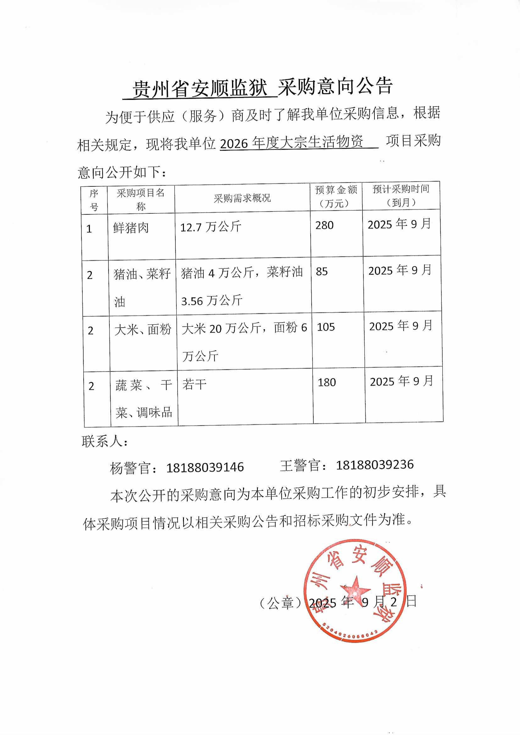 贵州省安顺监狱2026年度大宗生活物资采购意向公告