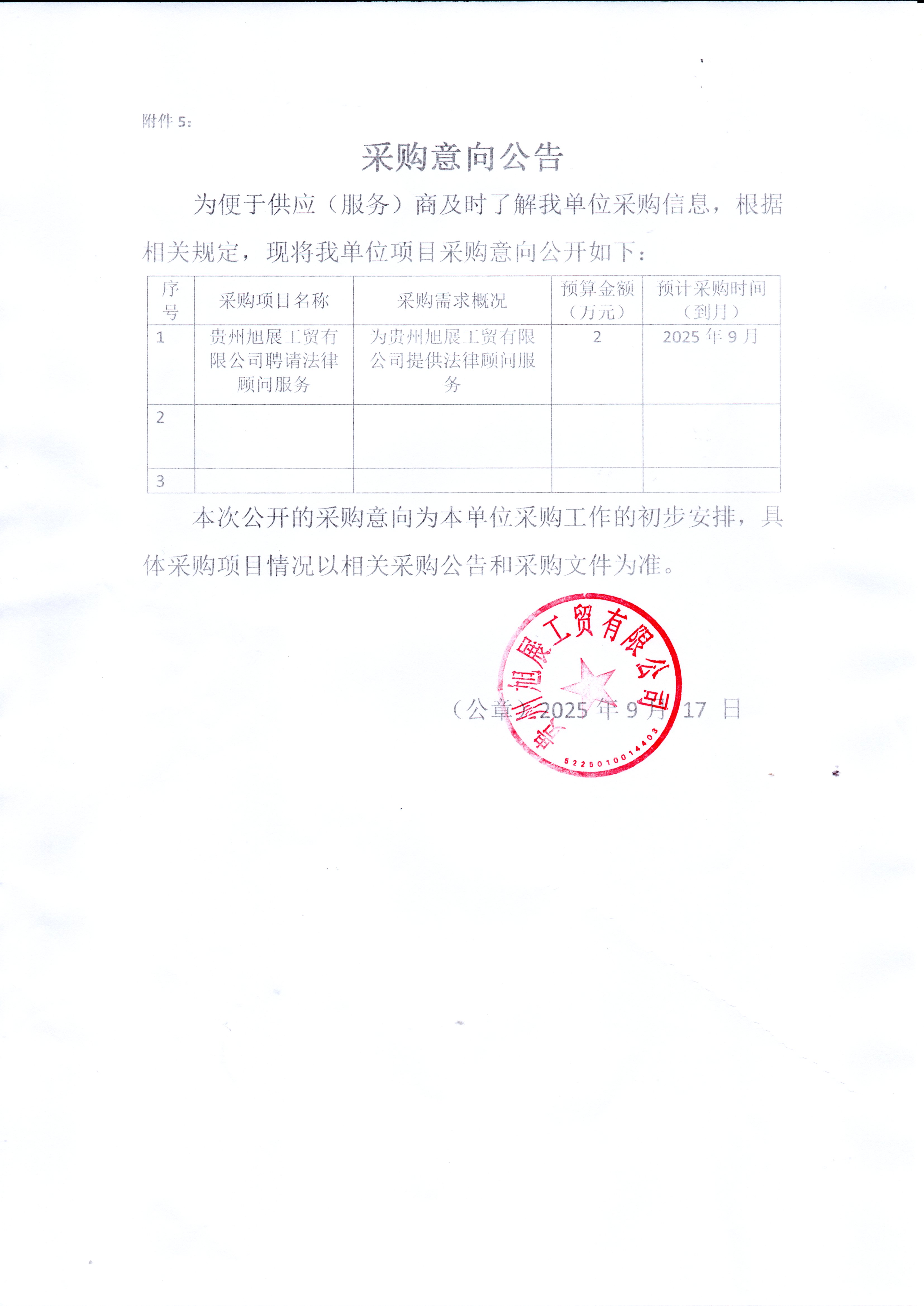 贵州旭展工贸有限公司聘请法律顾问服务采购意向公告