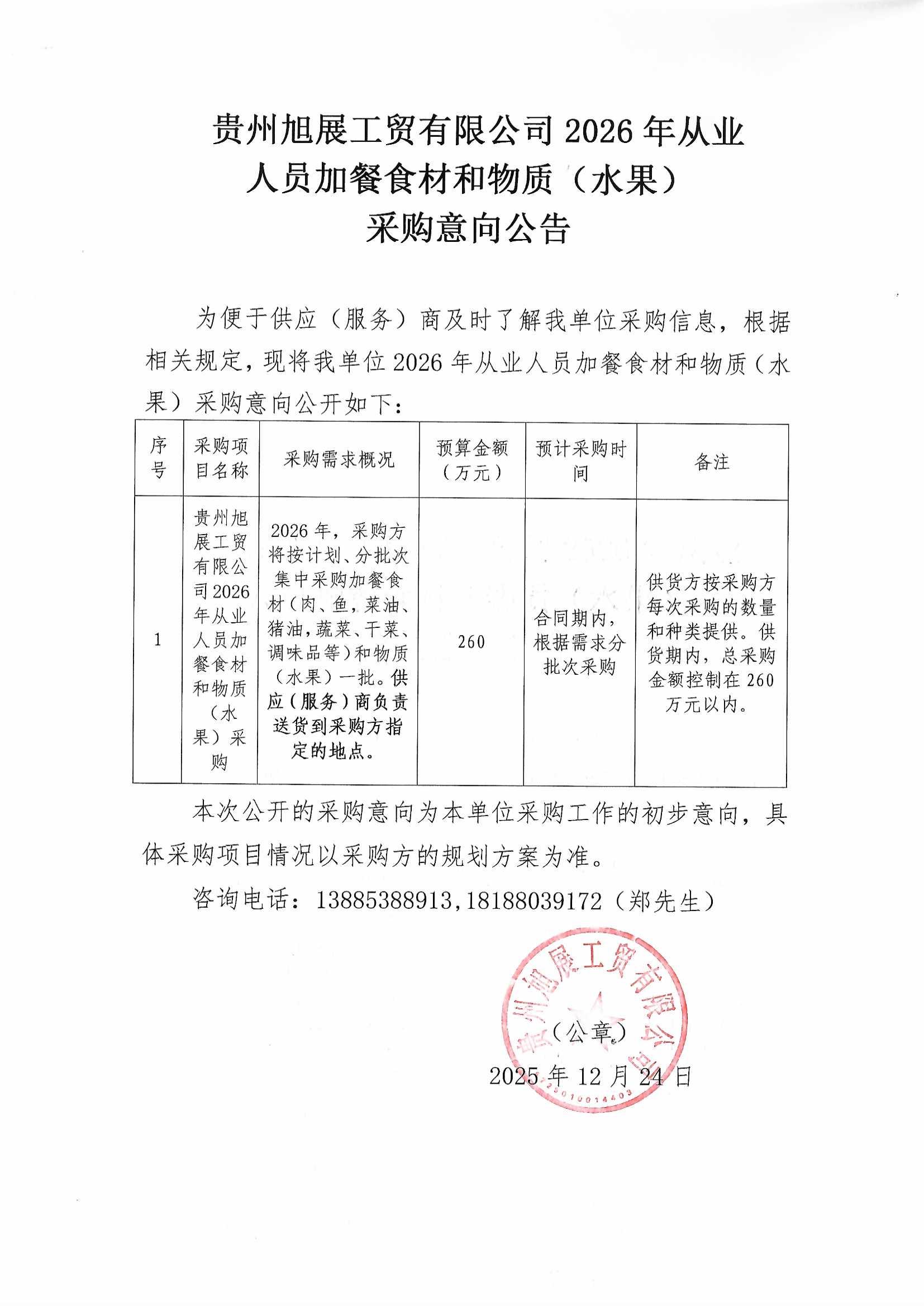 贵州旭展工贸有限公司2026年从业人员加餐食材和物质采购意向公告