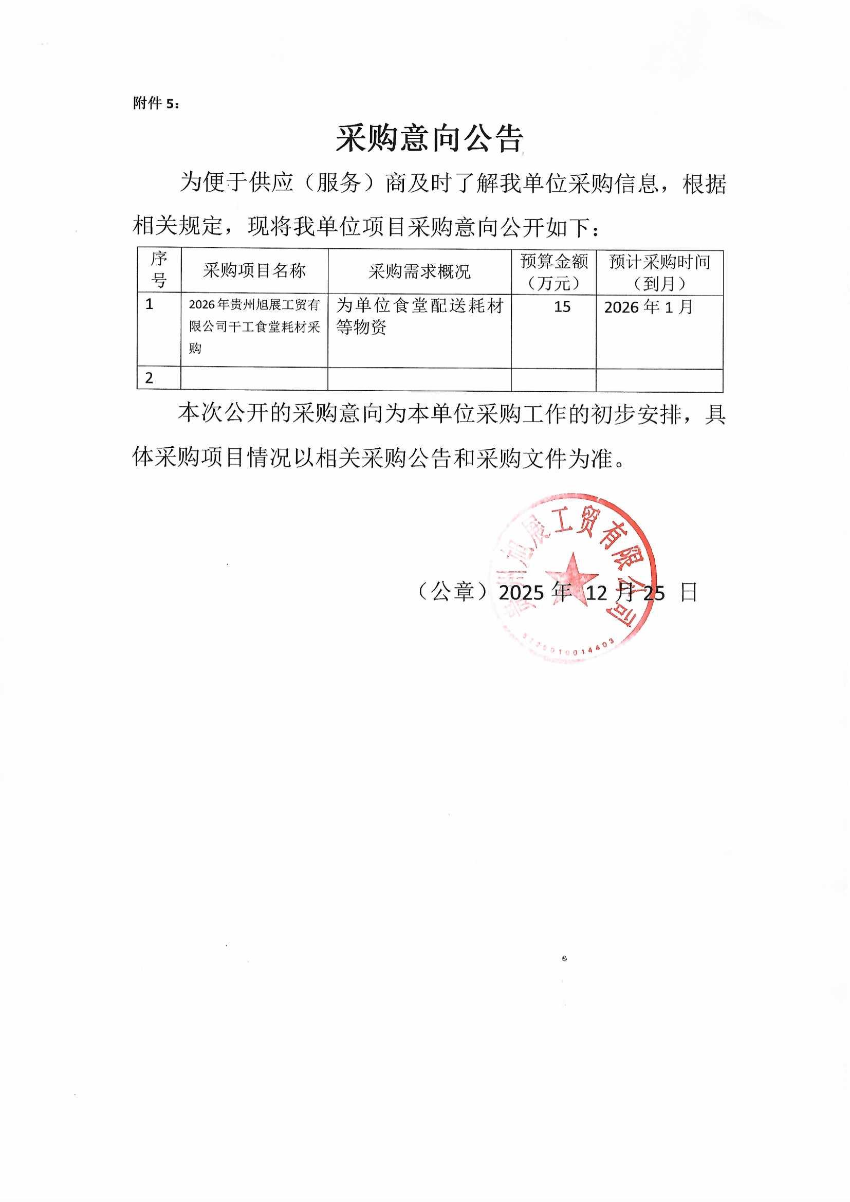 贵州旭展工贸有限公司干工食堂耗材采购项目意向公告