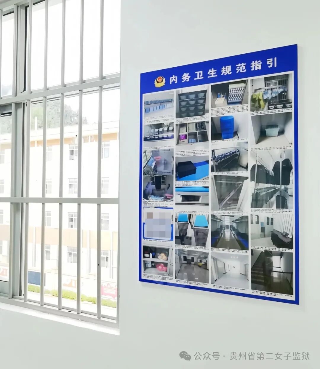 生活卫生科对床铺折叠、物品摆放、衣物晾晒等九大区域进行实地拍摄,将文字标准制作成“罪犯内务卫生规范化指引”并张贴于监舍走廊。