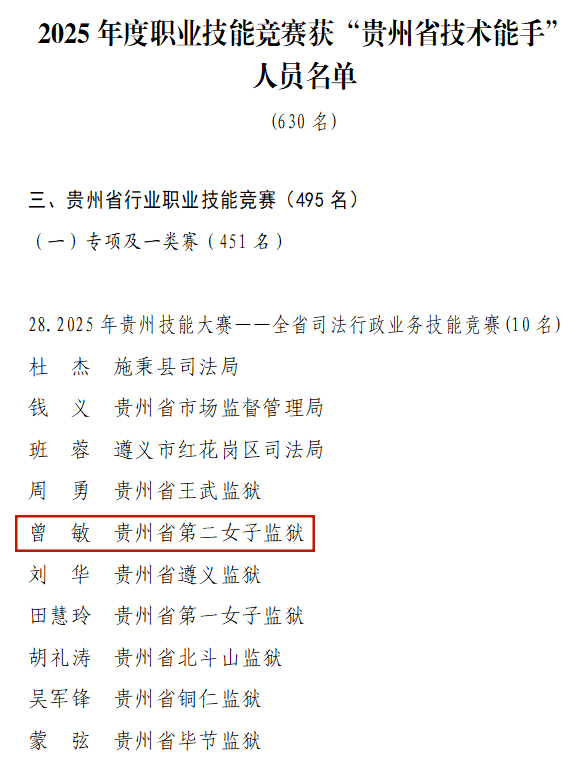 近日,贵州省人力资源社会保障厅公布2025年度职业技能竞赛优秀选手获得“贵州省技术能手”名单。第二女子监狱民警曾敏凭借扎实的业务能力和出色的赛场表现,在2025年贵州技能大赛——全省司法行政业务技能竞赛中荣获“贵州省技术能手”称号。
