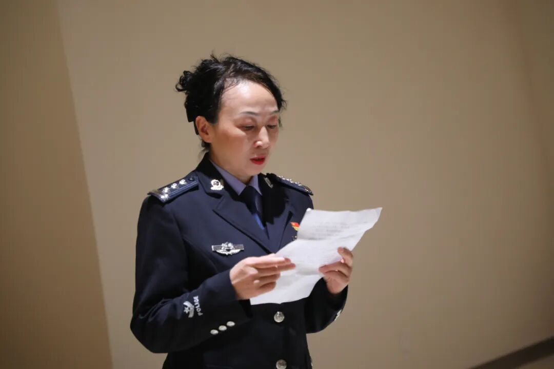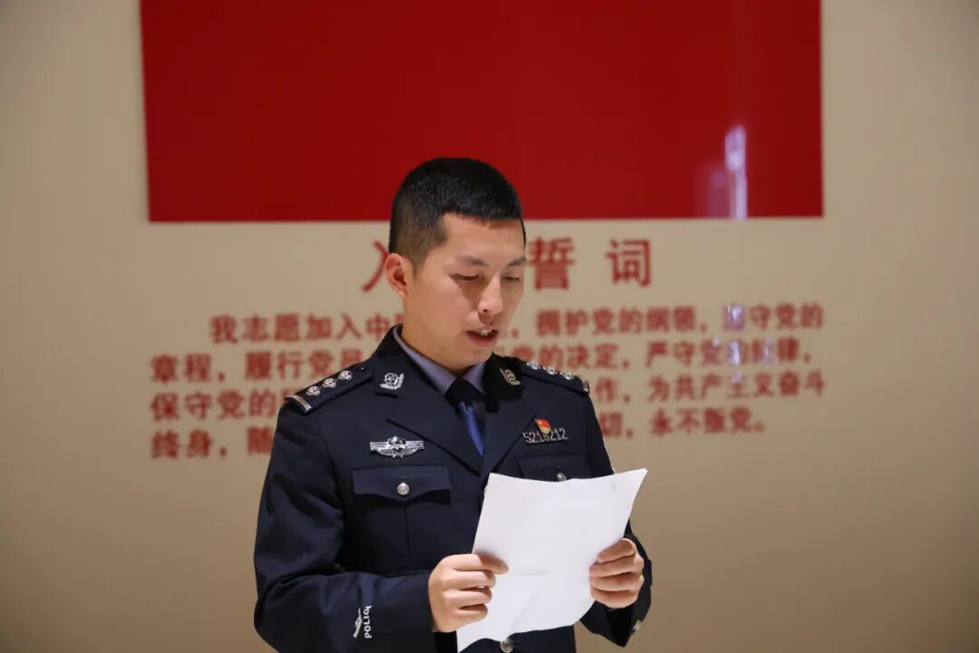 参观结束后,全体党员民警面向党旗,庄严地举起右拳,重温入党誓词。铿锵有力的誓言在馆内回荡,表达了民警们对党的无限忠诚和为共产主义奋斗终身的坚定决心。随后,青年民警分享了党史小故事,活动还为本月过政治生日的同志送上贺卡。