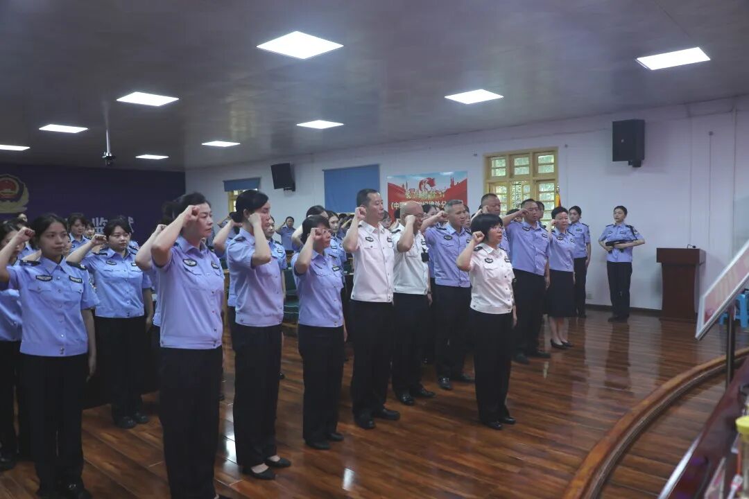 “我是中国人民警察,我宣誓:坚决拥护中国共产党的绝对领导......”。在监狱党委书记、监狱长杨芳的带领下,新警和退休民警以及在场民警面向警旗高举右拳,庄严宣誓,铿锵有力的誓词回荡在耳边,激励着每一位民警不忘初心,砥砺前行。