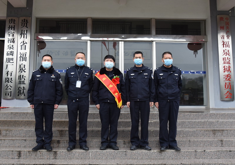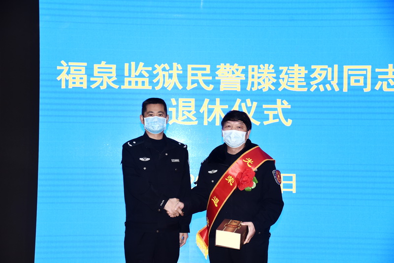 值班监狱领导,党委副书记、政委朱贵华亲自为老滕佩戴好“光荣退休”字样的绶带和大红花,从各值勤点赶来的民警代表们和老滕同志合影留念。