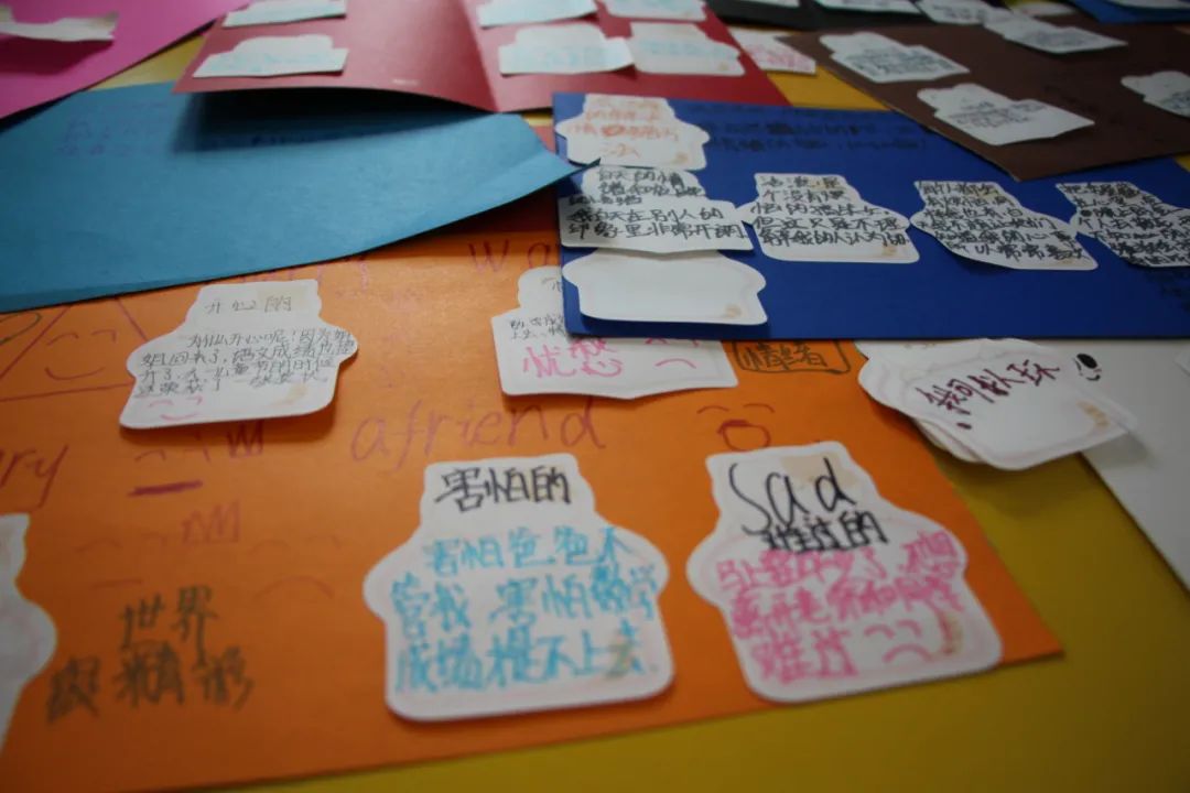 民警刘蓉通过游戏形式,引导现场三十多名孩子尽情释放自己,正确认识情绪、合理发泄内心压力,欢笑声洒满现场。随后,刘蓉又带领孩子们制作个人情绪压力卡——用便利贴将当下的感受、想法、学习生活中遇到的压力,以及处理情绪的方法写下来,并贴在卡纸上,教育孩子们遇事正确归因,有效调节情绪,成为情绪的主人。