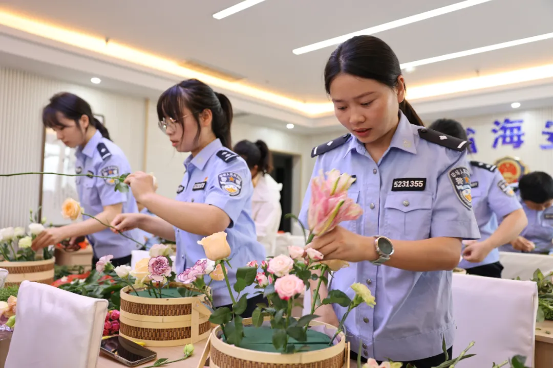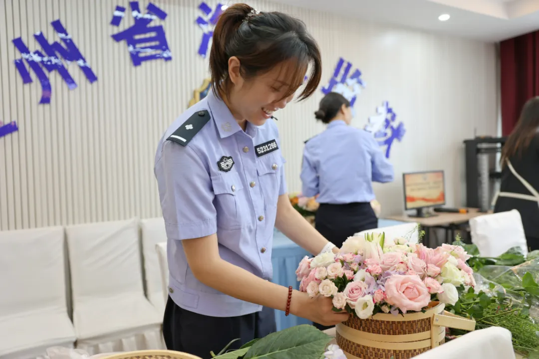 花艺体验环节,女民警职工们在专业花艺老师的指导下,暂时放下工作的繁忙,投入到插花艺术创作中。修剪花枝、构思造型、搭配色彩……大家兴致盎然,用心感受着花朵的芬芳与艳丽。在欢声笑语中,一篮篮错落有致、生机盎然的插花作品逐渐成形,寄托着大家对美好生活的向往与追求。
