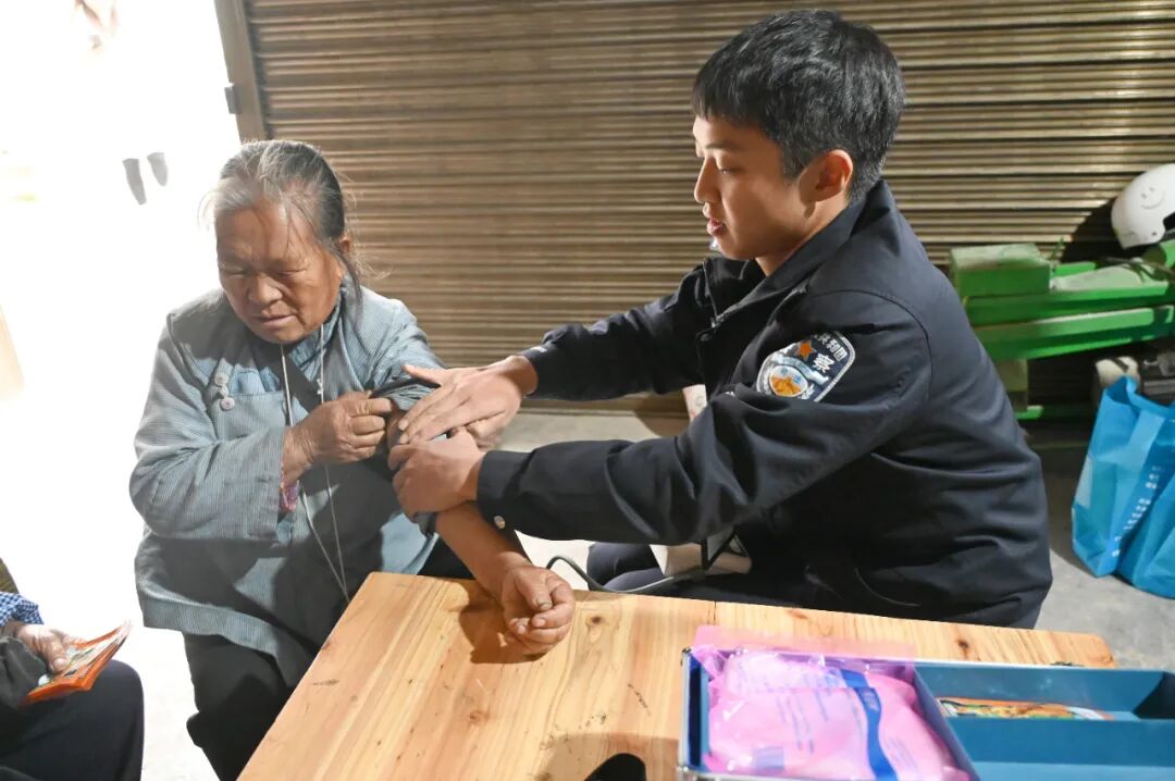 在村委会办公楼门前,民警们支起义诊小摊,前来问诊的村民陆续围拢过来。“饮食也要注意清淡,不要吃得太油腻了,还要避免过于激动。”义诊现场,医务民警有序为村民开展量血压、测心率、体检咨询、用药咨询、疾病防控知识宣传等服务。为了进一步方便村里行动不便的老人,医务民警拎着药箱开展走访问诊,主动送医到家,向村民们宣讲健康知识,赠送家庭常备药品,叮嘱他们科学合理用药,保持积极心态,适量参加运动,同时还为患有重大疾病的村民提供科学就诊建议。