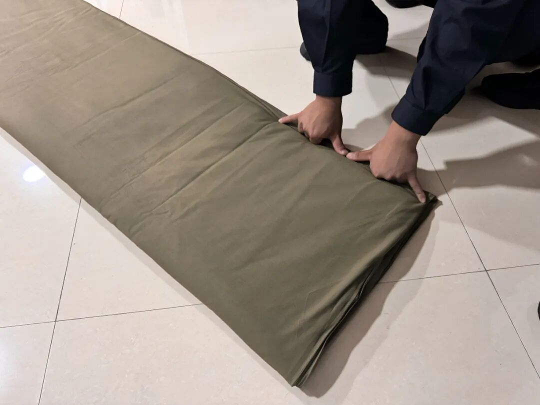 “压”——“九层之台,起于累土”。压实被芯是叠出棱角分明、线条硬朗、方正稳固“豆腐块”的根基。新警杨超现场演示并强调:“以肘发力,反复横扫,彻底消除蓬松褶皱,才能让被芯紧实如砥。”