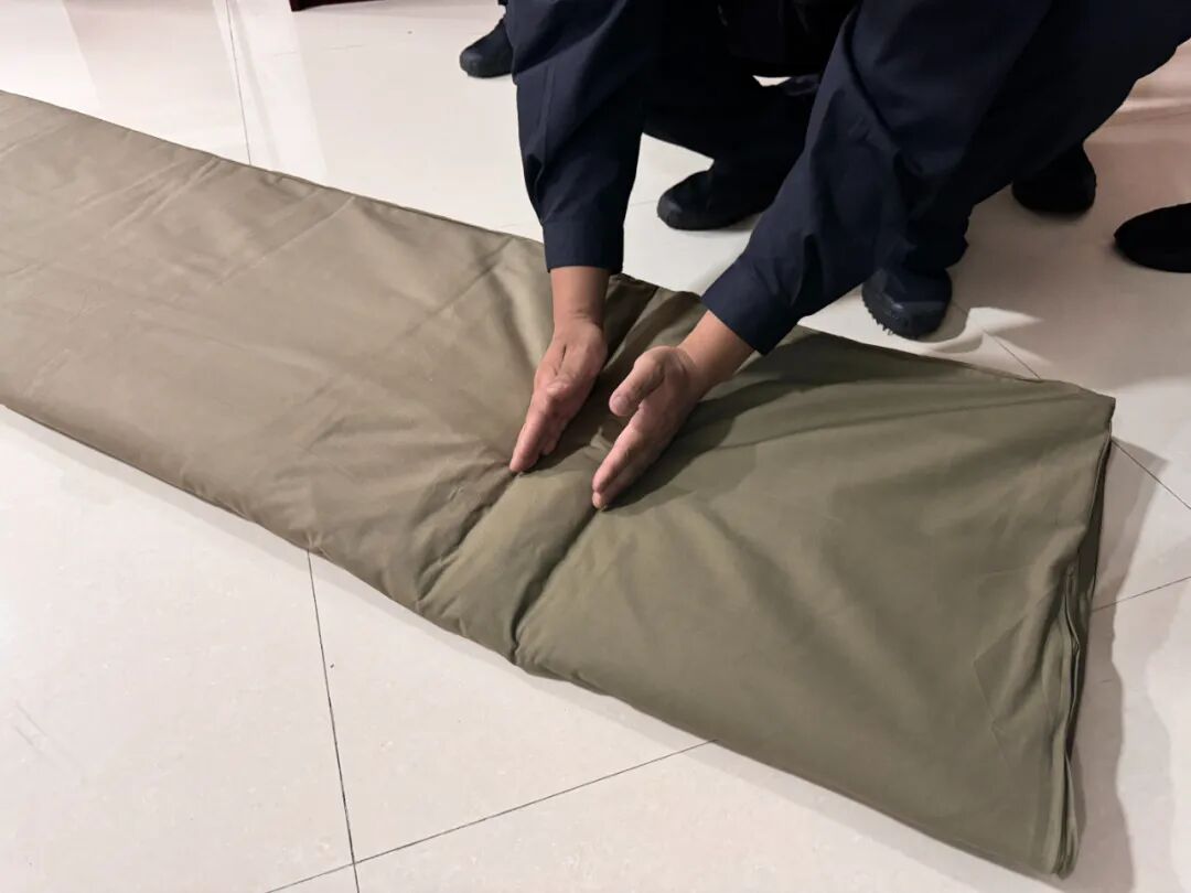 “捏”——精修棱角,力塑直线。捏被既是技术,也需力道与耐心。“发力要透,被面被芯同揉捏,”新警李显阳边示范边讲解,“竖线横线逐道塑,边角接缝无遗漏,直至捏出刀削斧劈般的笔直线条!”