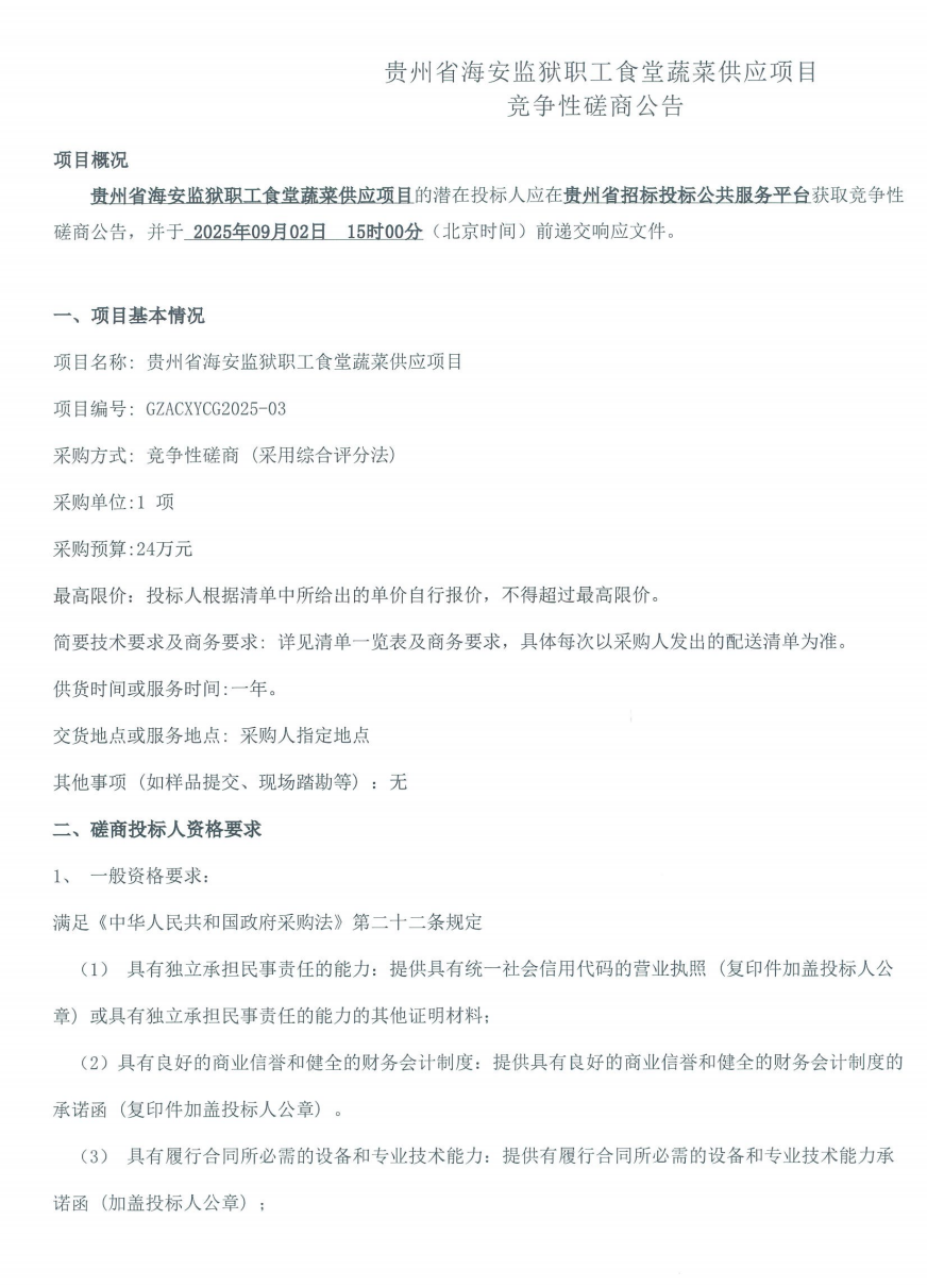 贵州省海安监狱职工食堂蔬菜供应项目竞争性磋商公告