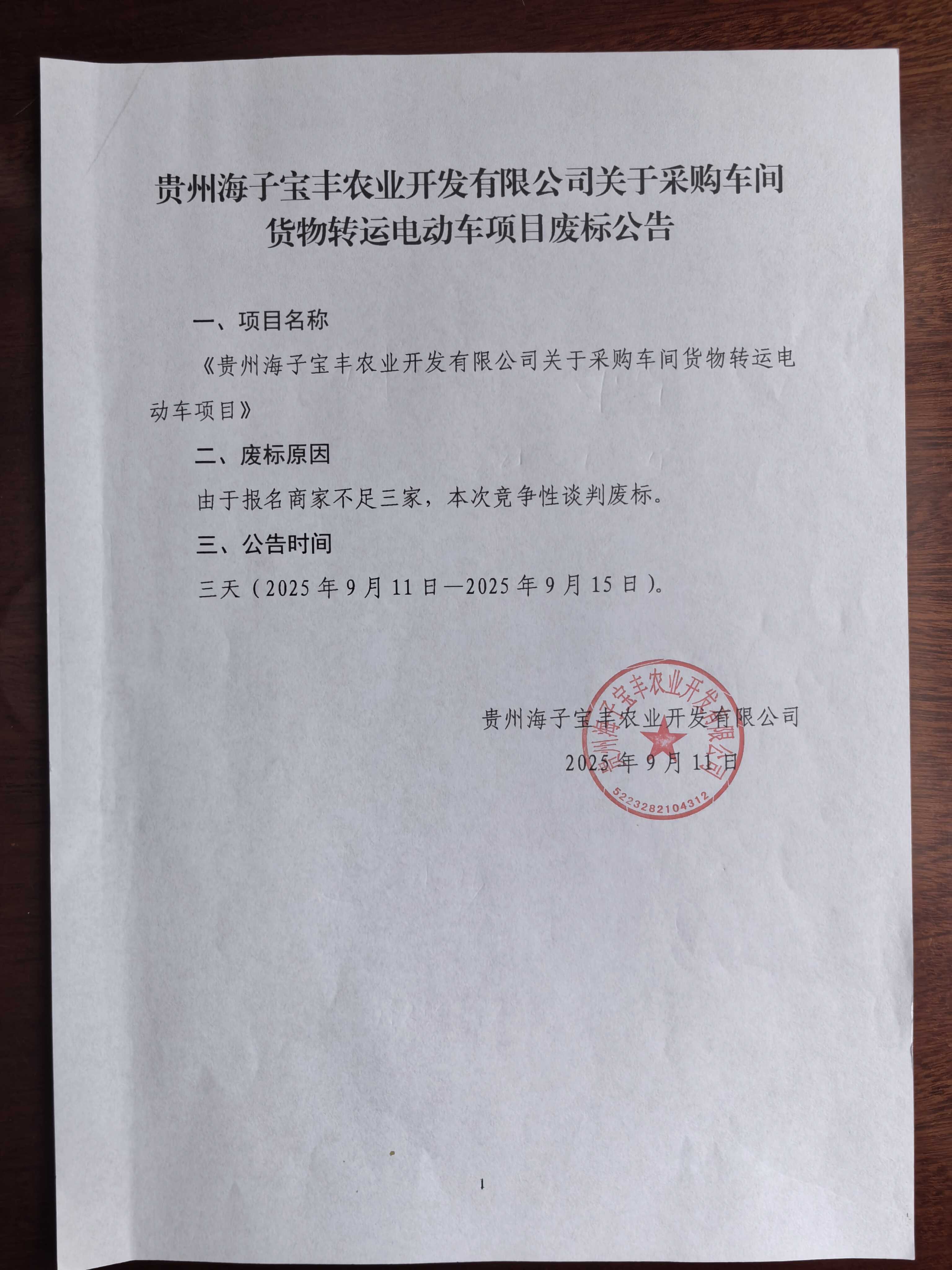 贵州海子宝丰农业开发有限公司采购车间货物转运电动车项目二次废标公告
