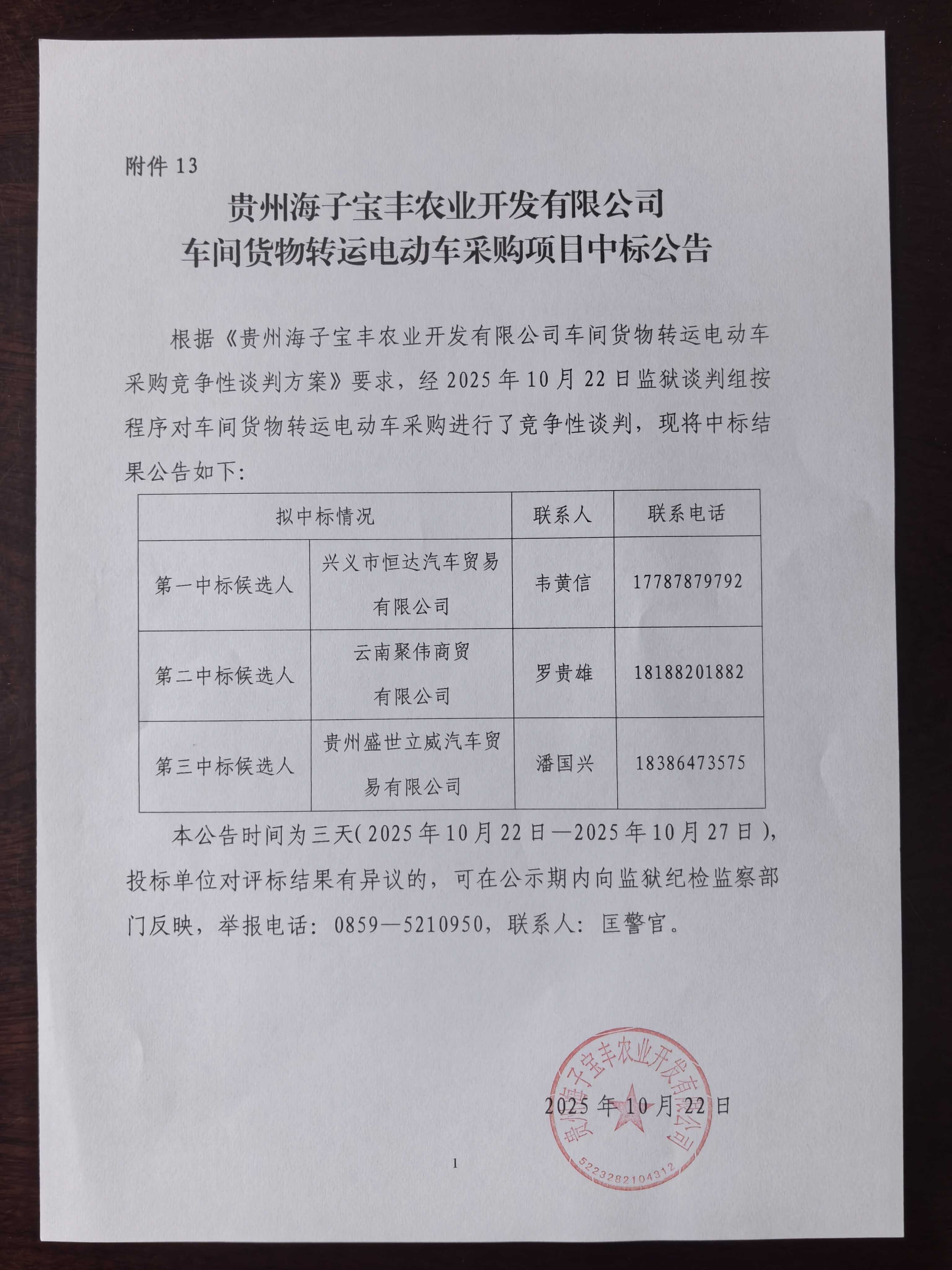 贵州海子宝丰农业开发有限公司车间货物转运电动车采购项目中标公告