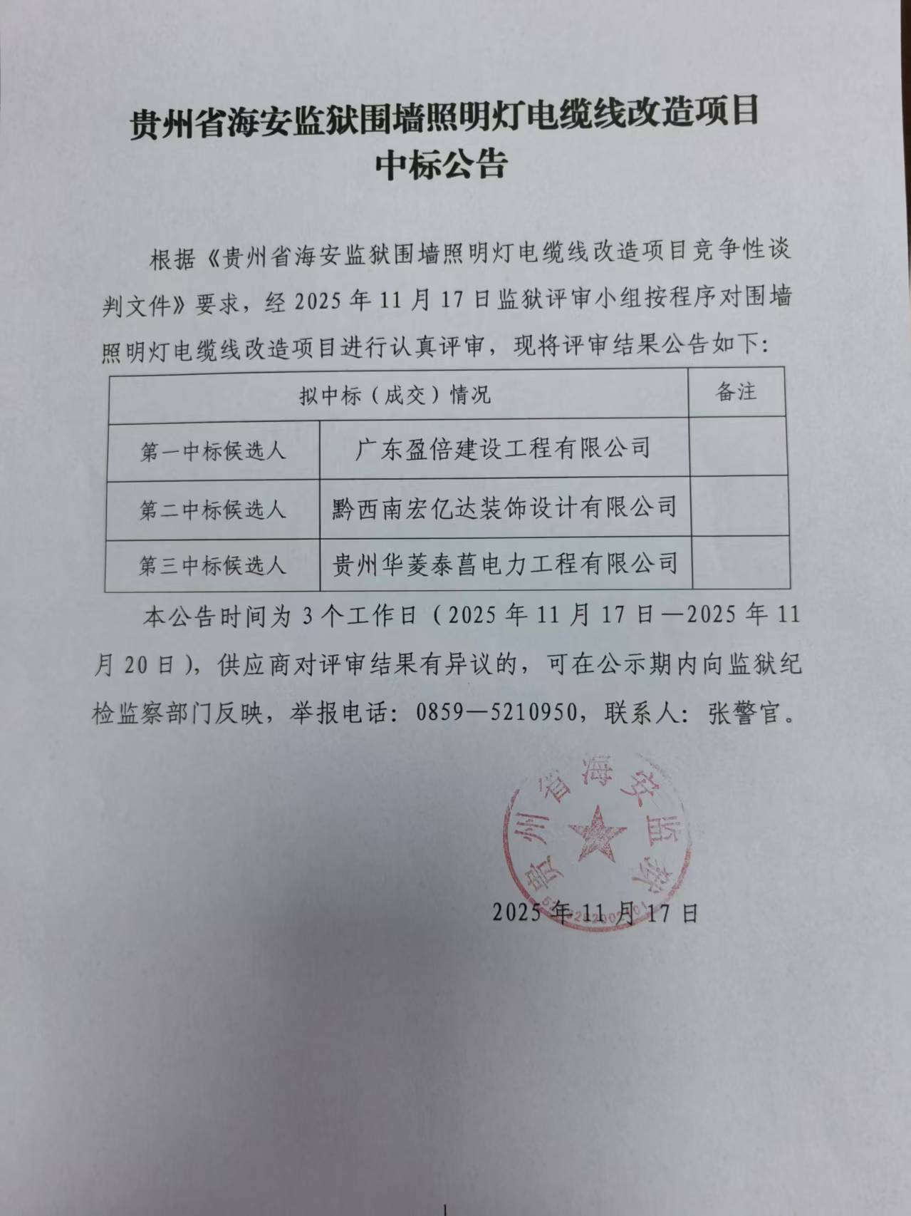 贵州省海安监狱围墙照明灯电缆线改造项目中标公告
