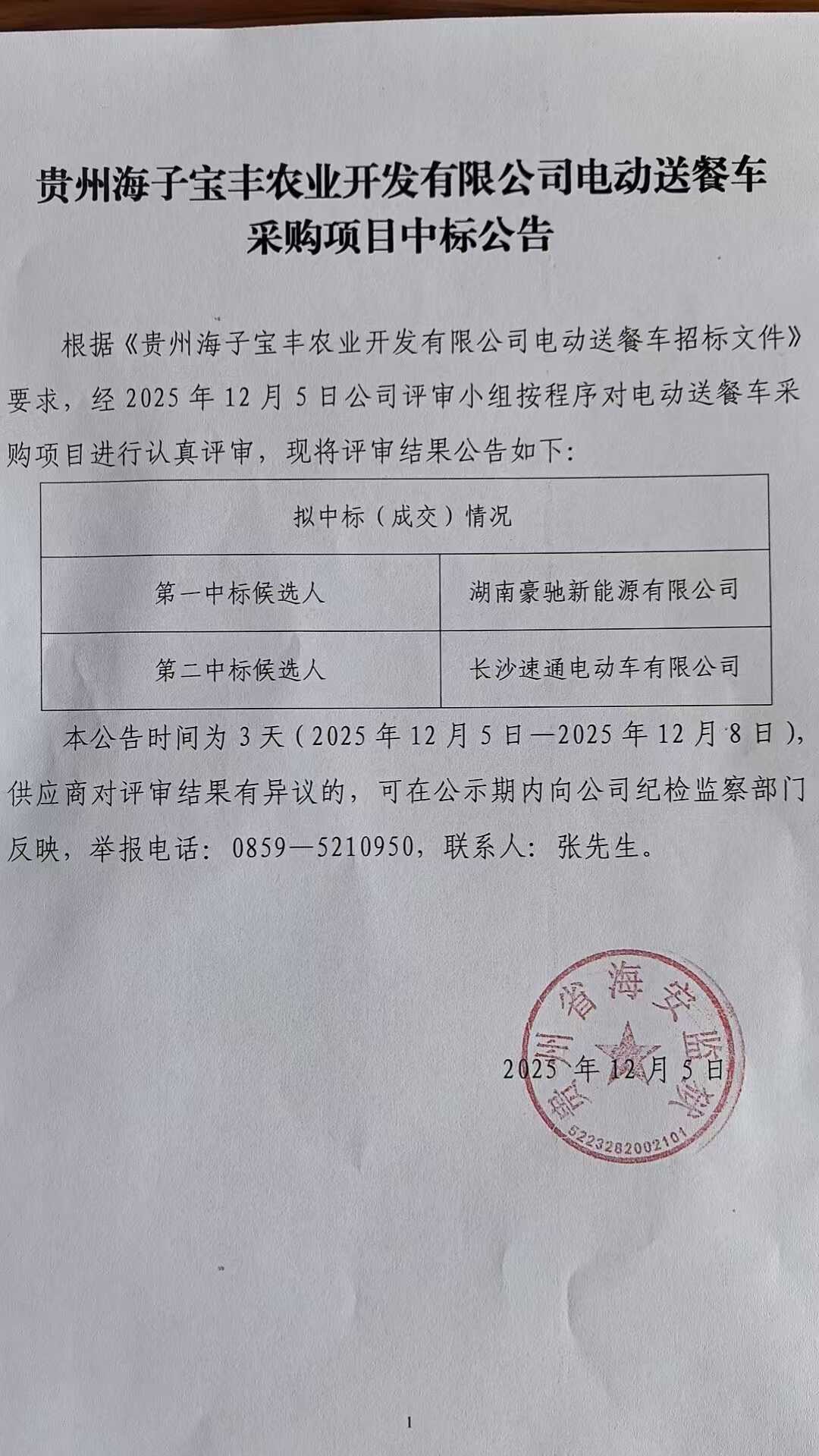 贵州海子宝丰农业开发有限公司电动送餐车采购项目中标公告