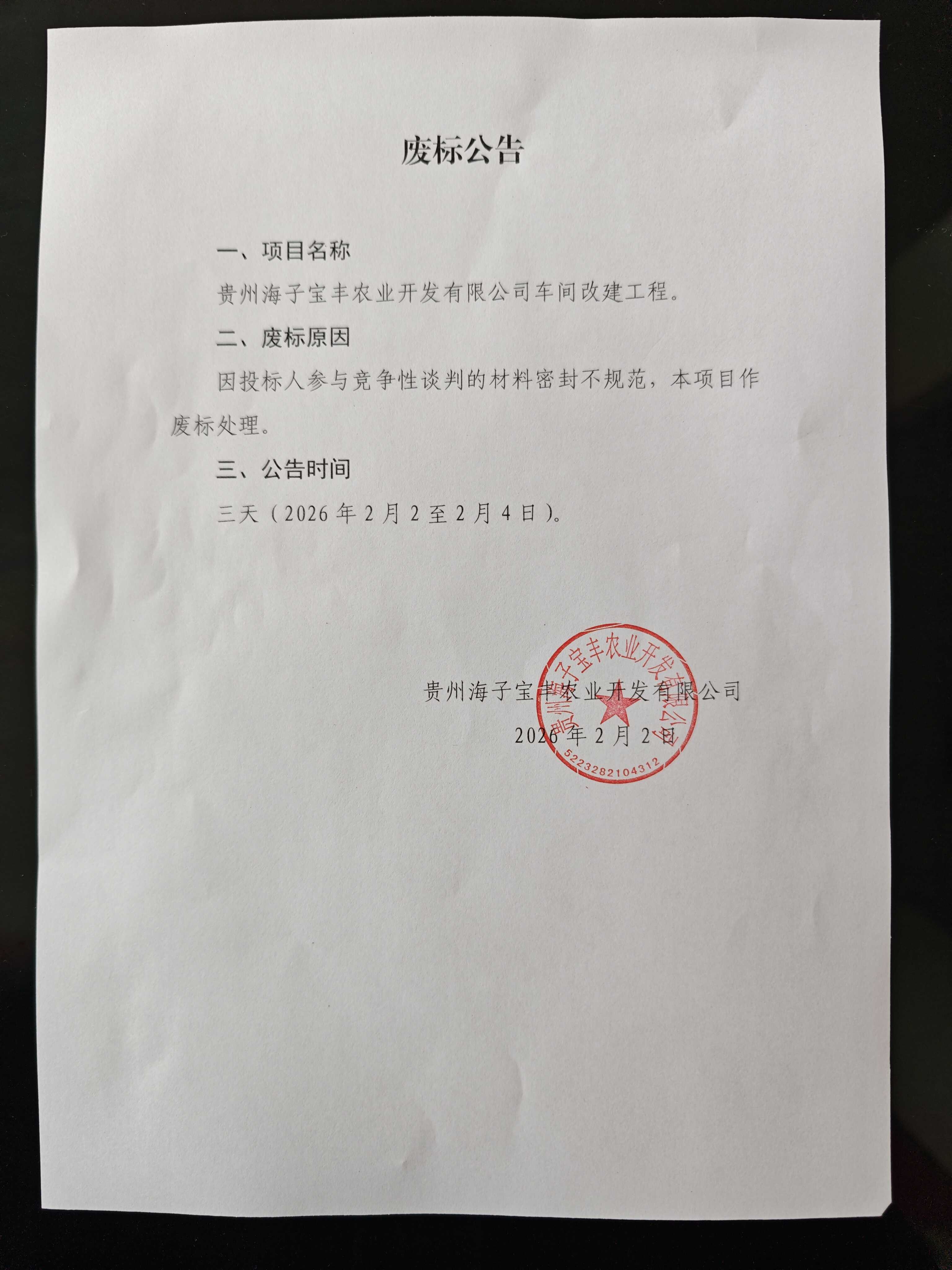贵州海子宝丰农业开发有限公司车间改建工程采购项目流标公告