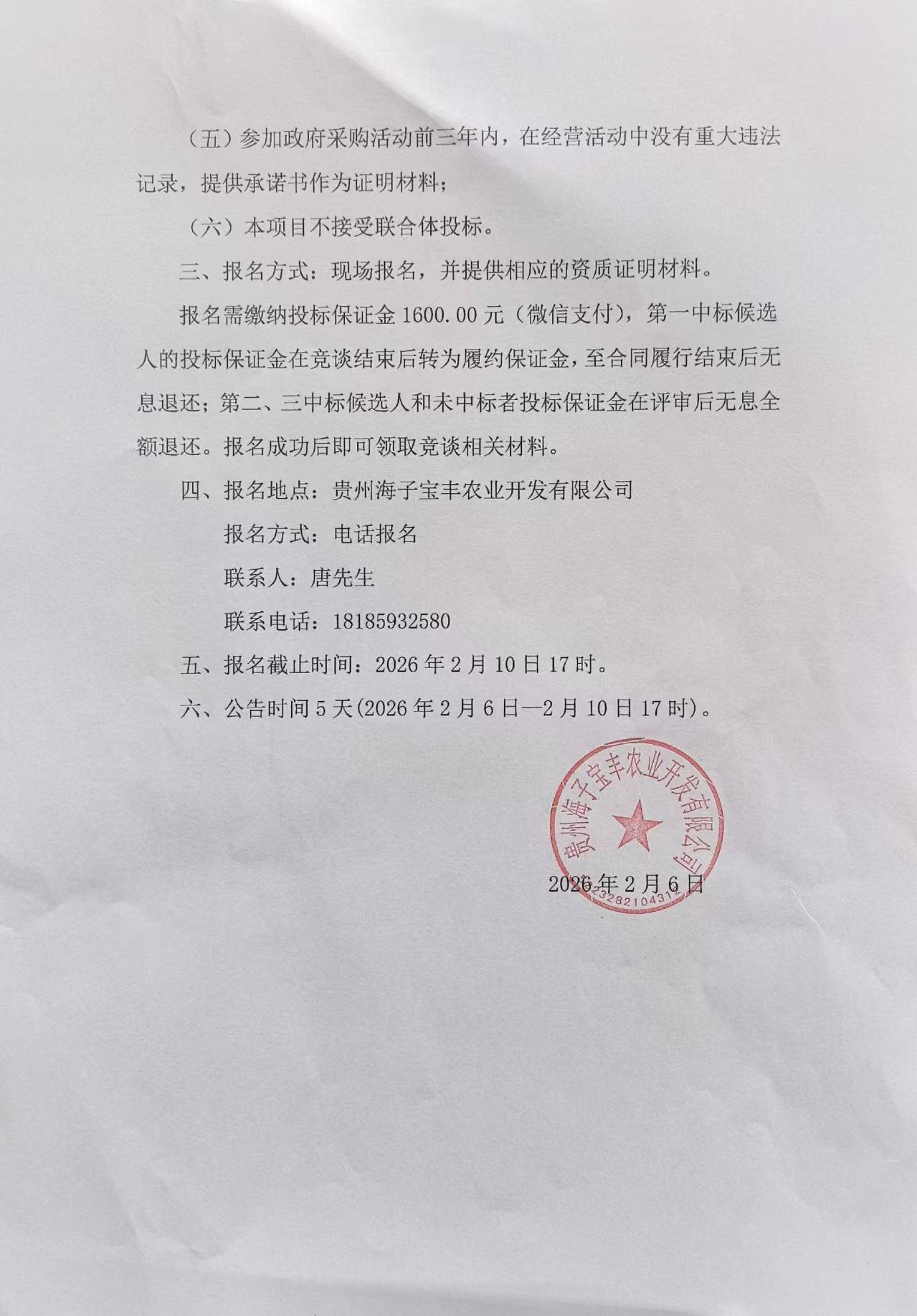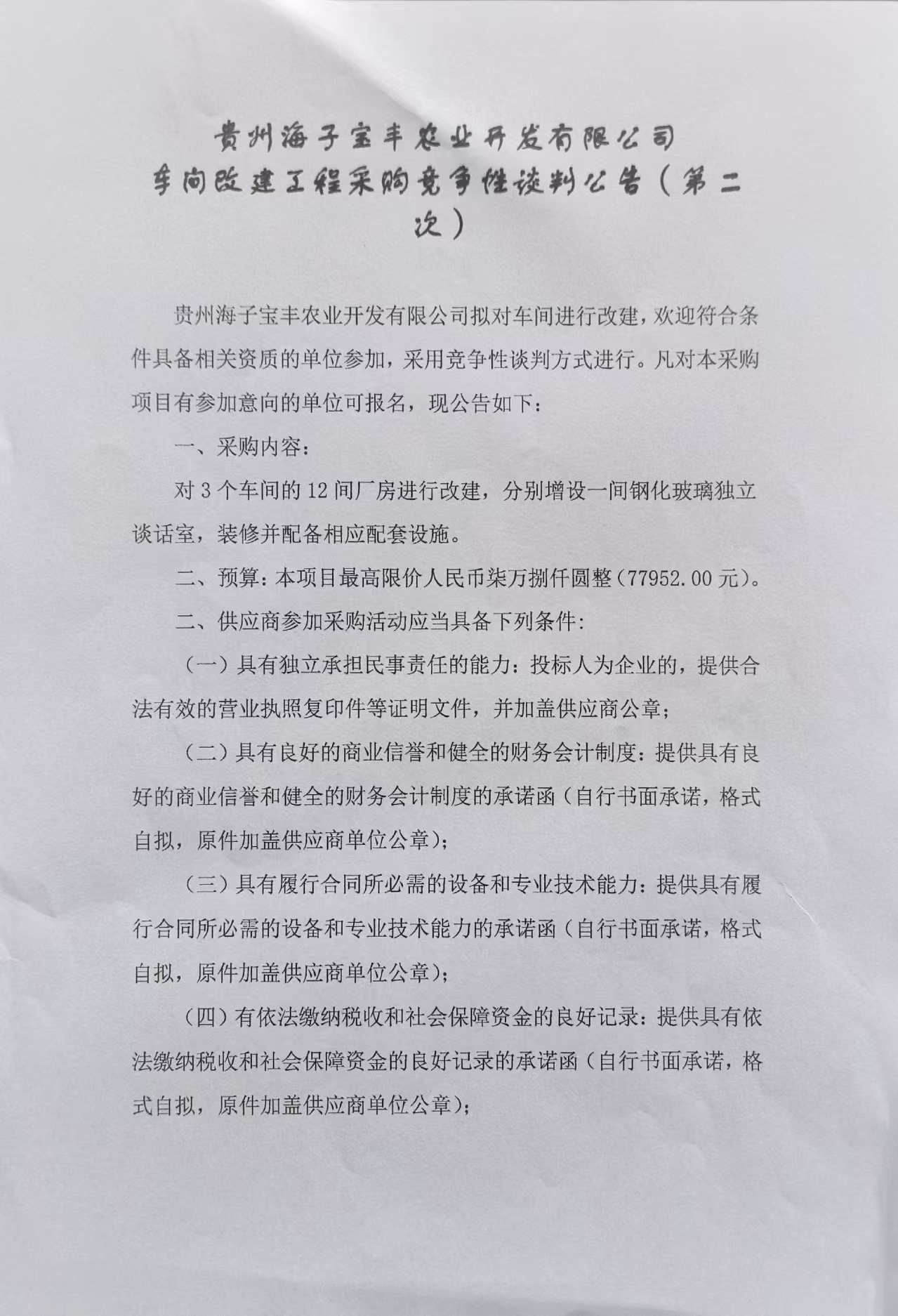 贵州海子宝丰农业开发有限公司车间改建工程采购竞争性谈判公告(第二次)