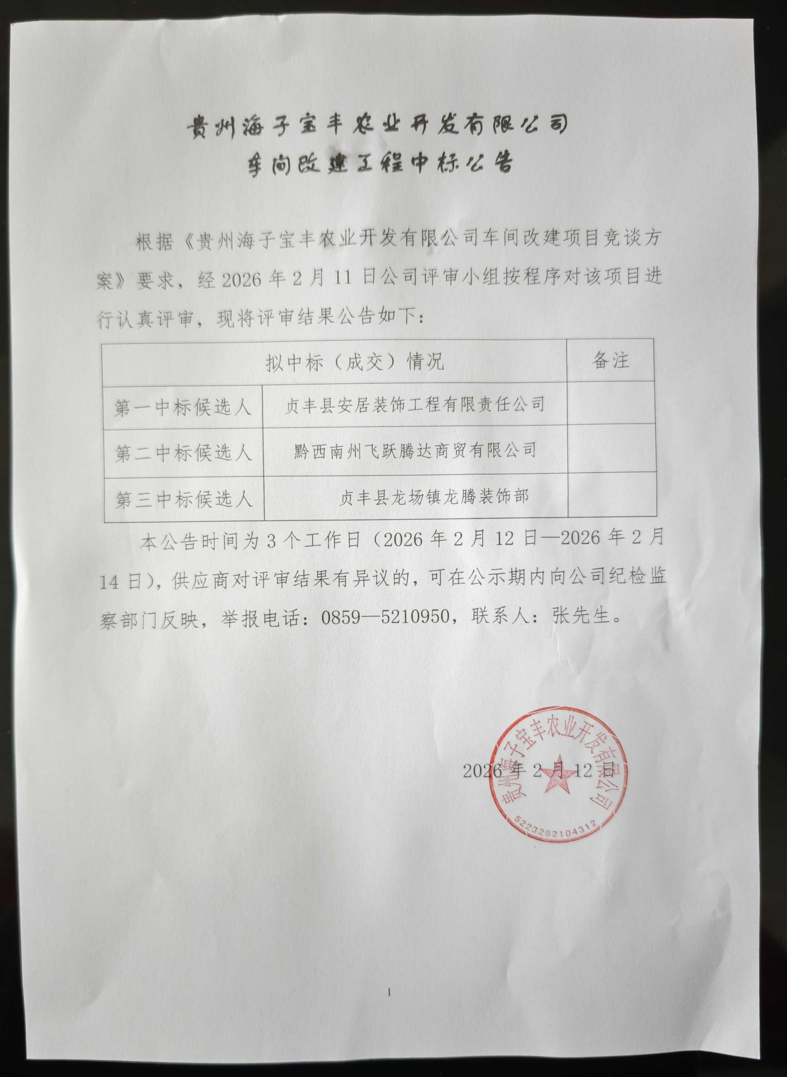 贵州海子宝丰农业开发有限公司车间改建工程中标公告