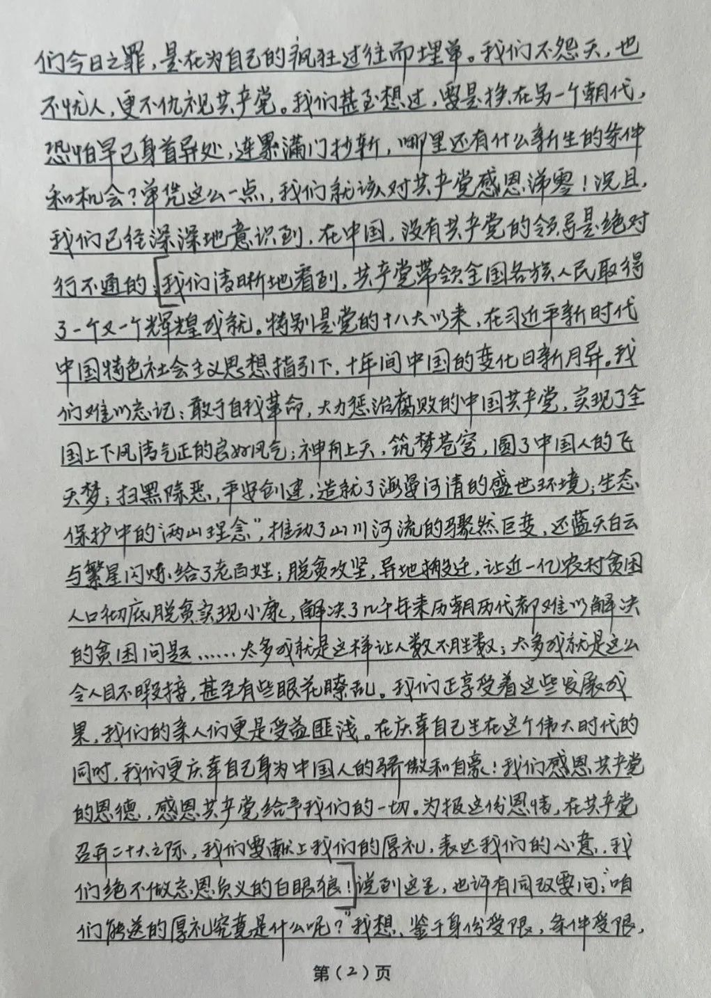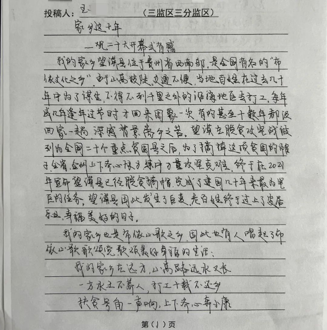 在监狱的组织下收听完党的二十大报告后,三监区罪犯覃某在思想汇报中这样写道:“我们清晰地感受到中国共产党带领全国各族人民取得了一个又一个辉煌成就。十年间中国的变化日新月异,我们难以忘记——敢于自我革命、大力惩治腐败的中国共产党实现了全国上下风清气正的良好局面;神舟上天、筑梦苍穹,圆了中国人的飞天梦;扫黑除恶、平安创建,造就了海晏河清的盛世风光;生态保护中的‘两山理念’让山更青、水更蓝,将蓝天白云与满天繁星重新还给老百姓。”覃某由衷地说到:“我庆幸自己生在这个伟大的时代,更庆幸自己生在这个伟大的国家。我为自己是一名中国人而骄傲自豪,这也是我努力改造自己的原动力!”党的二十大报告中指出,我们坚持精准扶贫、尽锐出战,打赢了人类历史上规模最大的脱贫攻坚战,全国八百三十二个贫困县全部摘帽,近一亿农村贫困人口实现脱贫,九百六十多万贫困人口实现易地搬迁,历史性地解决了绝对贫困问题,为全球减贫事业作出了重大贡献。