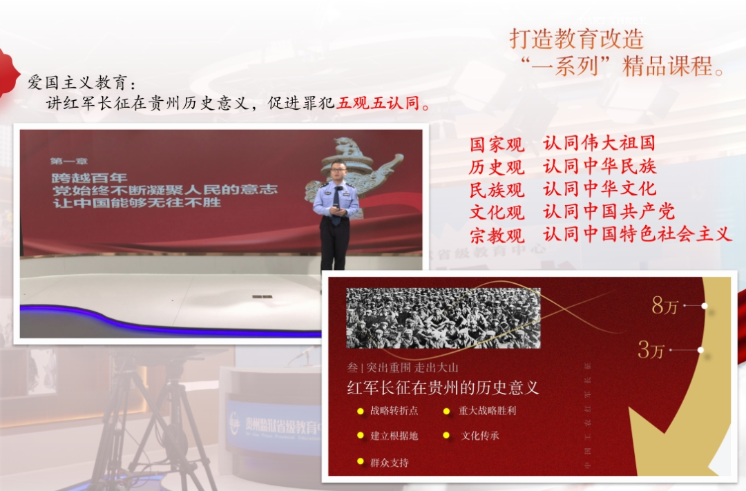 “云端”课堂聚合内外资源。建立省级教育中心,构建“一个平台、全域共享”的罪犯集体教育新模式,调动系统内外优质教育资源,每月2期开展“云”教学直播,向全省监狱罪犯开展爱国主义、法治教育、中华优秀传统文化等线上授课,“讲得好,听得懂,触动深”已是罪犯口中的主流评价。