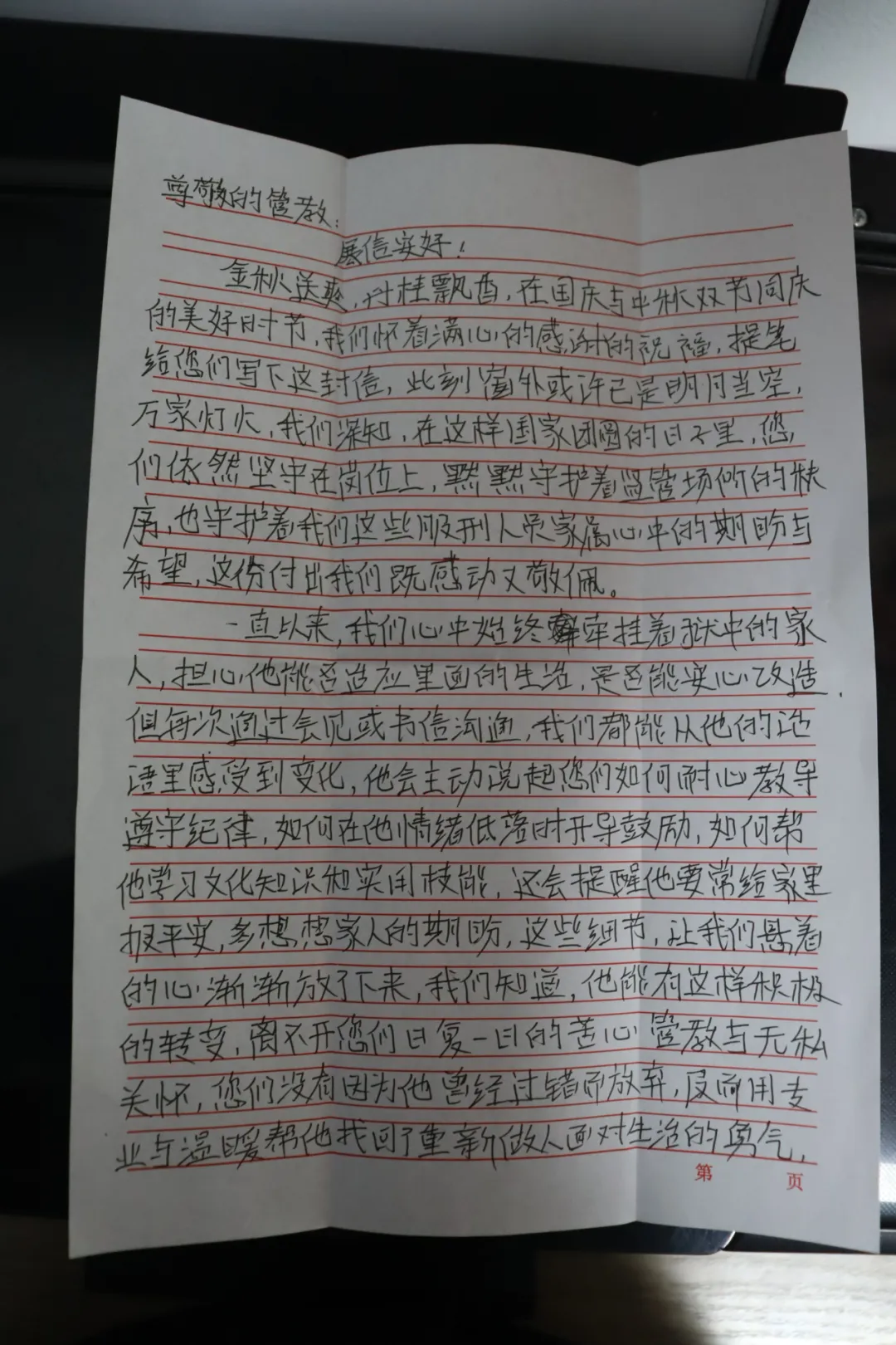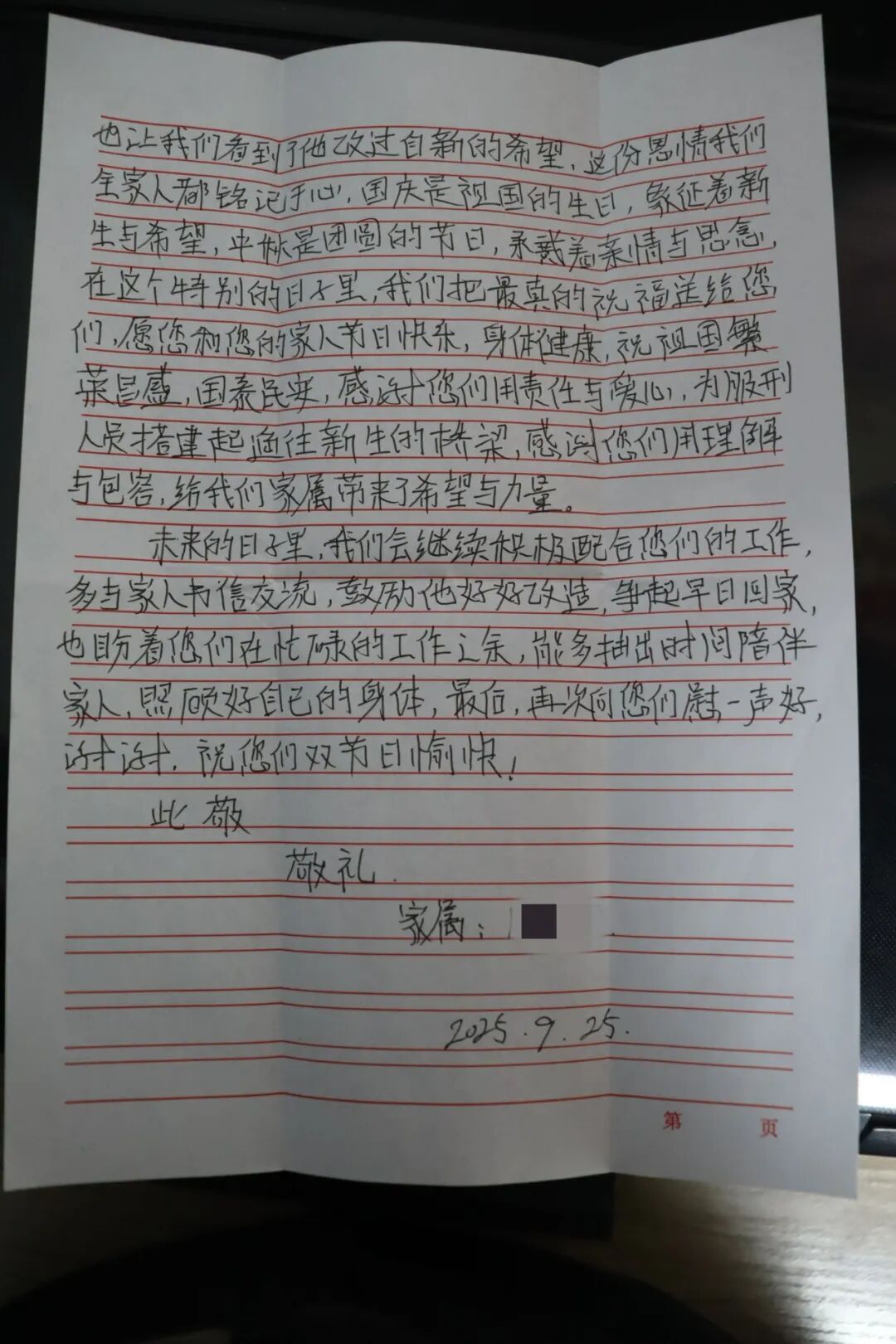 “一直以来我们心中始终牵挂着狱中的家人,担心他能否适应里面的生活,是否能安心改造。但每次通过会见或书信沟通,我们都能从他的话语里感受到变化:他会主动说起你们如何耐心教导他遵守纪律,如何在他情绪低落时开导鼓励,如何帮他学习文化知识和实用技能……”信中字字句句饱含真情,“他能有这样的转变,离不开您们的日复一日的管教与帮助,你们没有因为他曾经的过错而放弃,反而用专业与温暖帮他找回了重新做人、面对生活的勇气……”