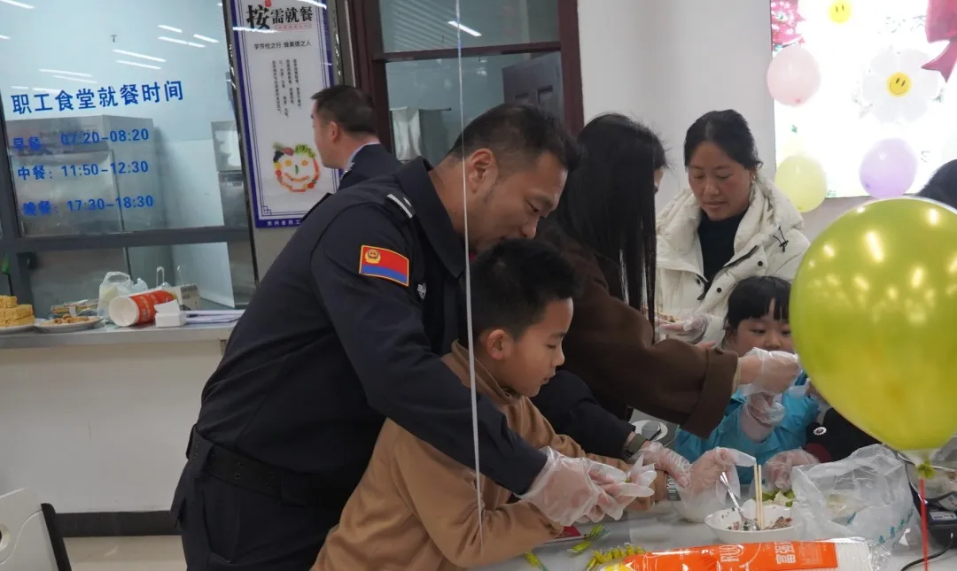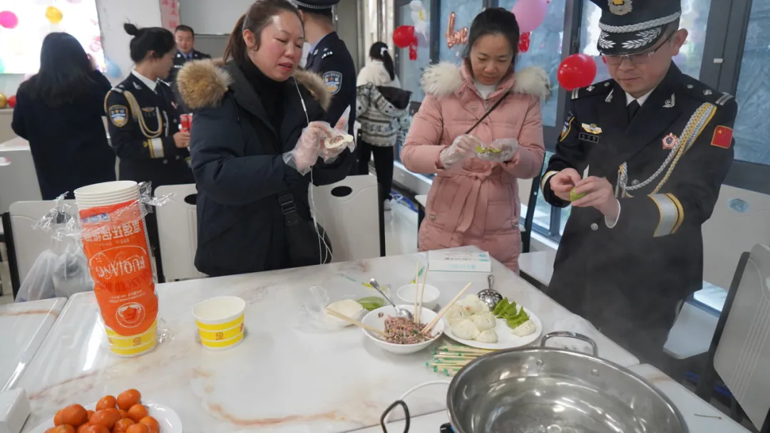 活动最后,民警与家属们共进午餐,共享团圆时刻。大家围坐一堂,畅叙家常,分工协作,将揉面、擀皮、包饺子一气呵成,各展身手,共同完成一个个饱满圆润的“平安饺”。