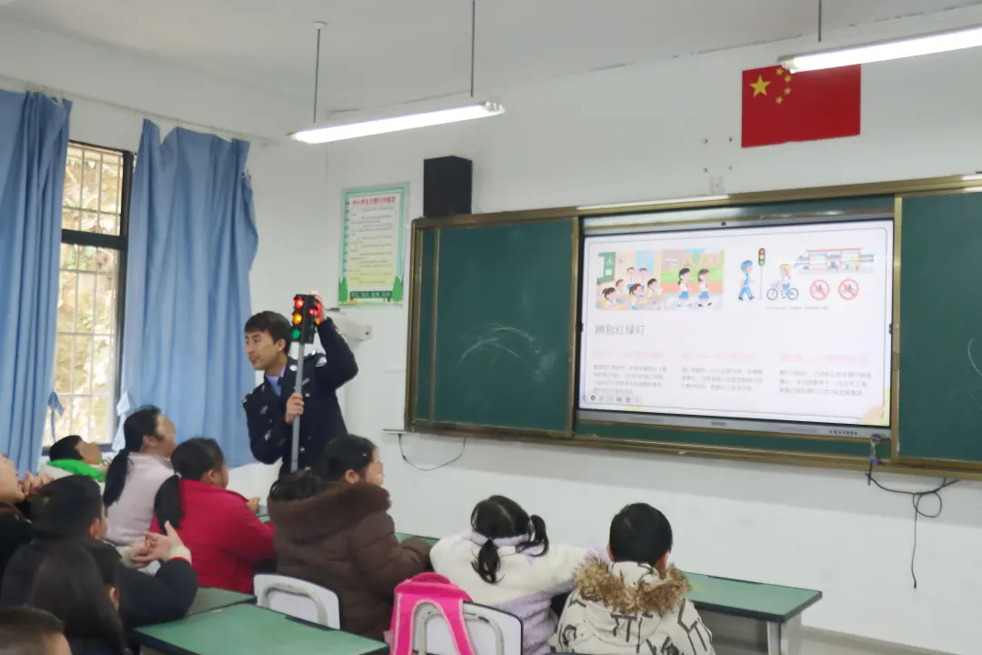交通安全课上,民警带来了红绿灯教具,在教室里“模拟过马路”,让孩子们扮演行人,亲自体验“红灯停、绿灯行”。孩子们踊跃参与,在游戏互动中记住了交通规则。