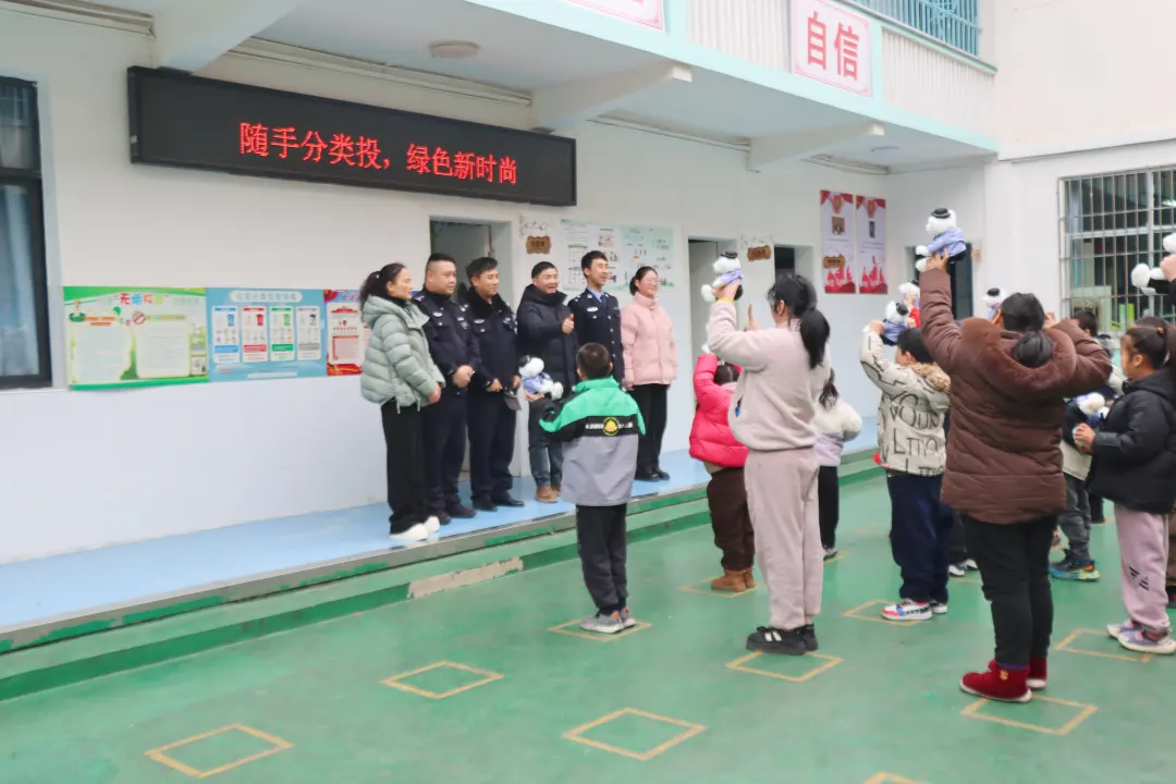 在财产认知环节,民警设计了用劳动换取零食的情景剧,通过“帮忙发纸巾换零食”和“擅自拿取零食”的情景对比,生动诠释“劳动所得才合法”的道理。对于有互动困难的孩子,民警蹲下身轻声引导,耐心等待他们融入活动。