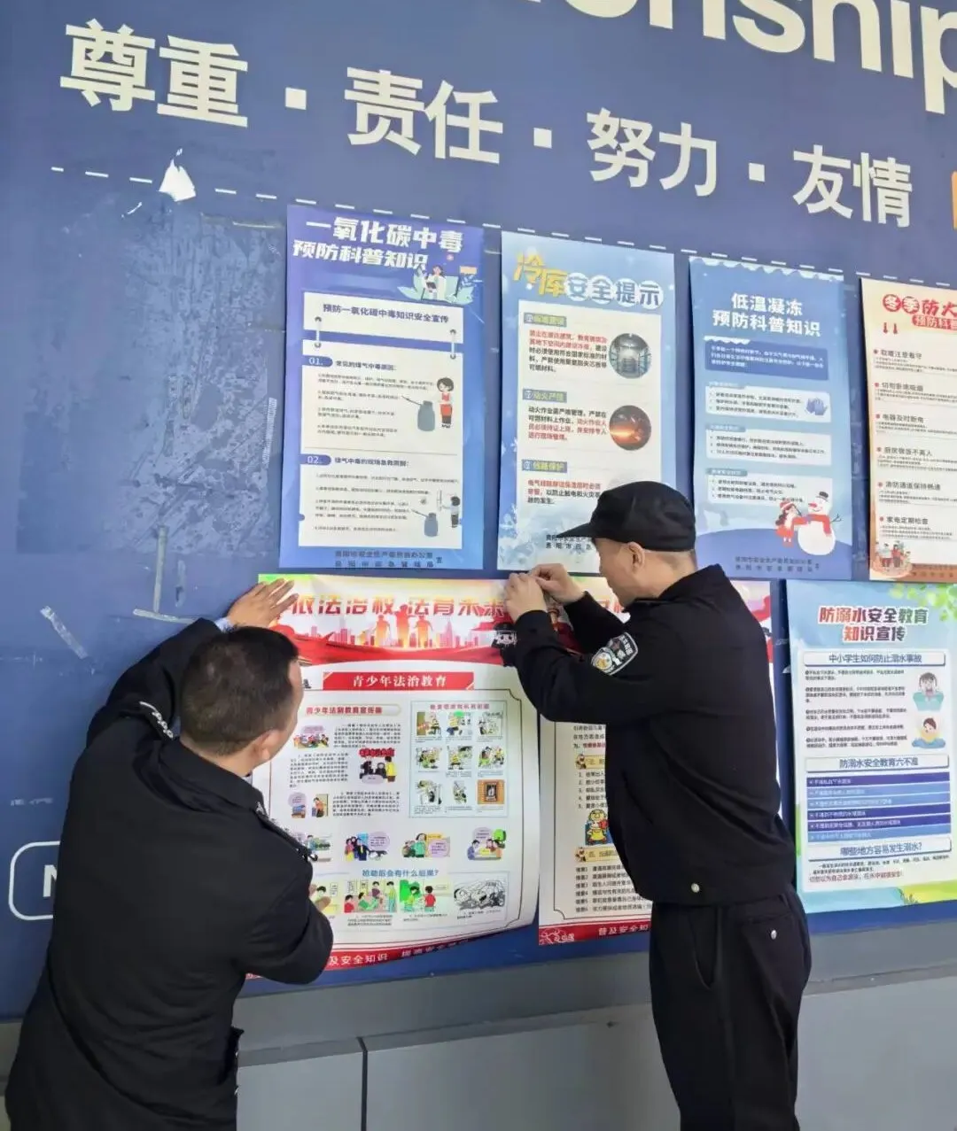 活动结束后,民警与学校老师一同在走廊张贴法治宣传海报,将法律知识融入校园日常环境中。