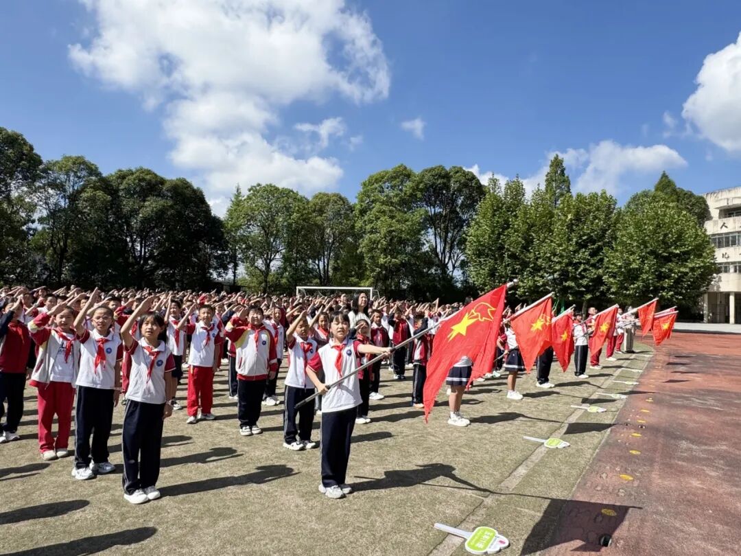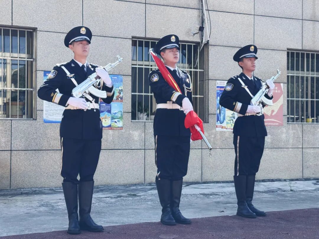 上午9时,活动在学校操场正式启动。金西监狱“国旗班”民警身着笔挺制服,肩扛国旗迈着整齐划一的正步入场,铿锵的脚步声划破校园宁静。伴随着激昂的《义勇军进行曲》,五星红旗冉冉升起,全校师生肃立行注目礼,嘹亮的歌声在校园回荡。民警们标准的敬礼姿势、严谨的仪式流程,不仅展现了新时代监狱人民警察的良好风貌,更让孩子们在庄重的氛围中厚植爱国情怀。