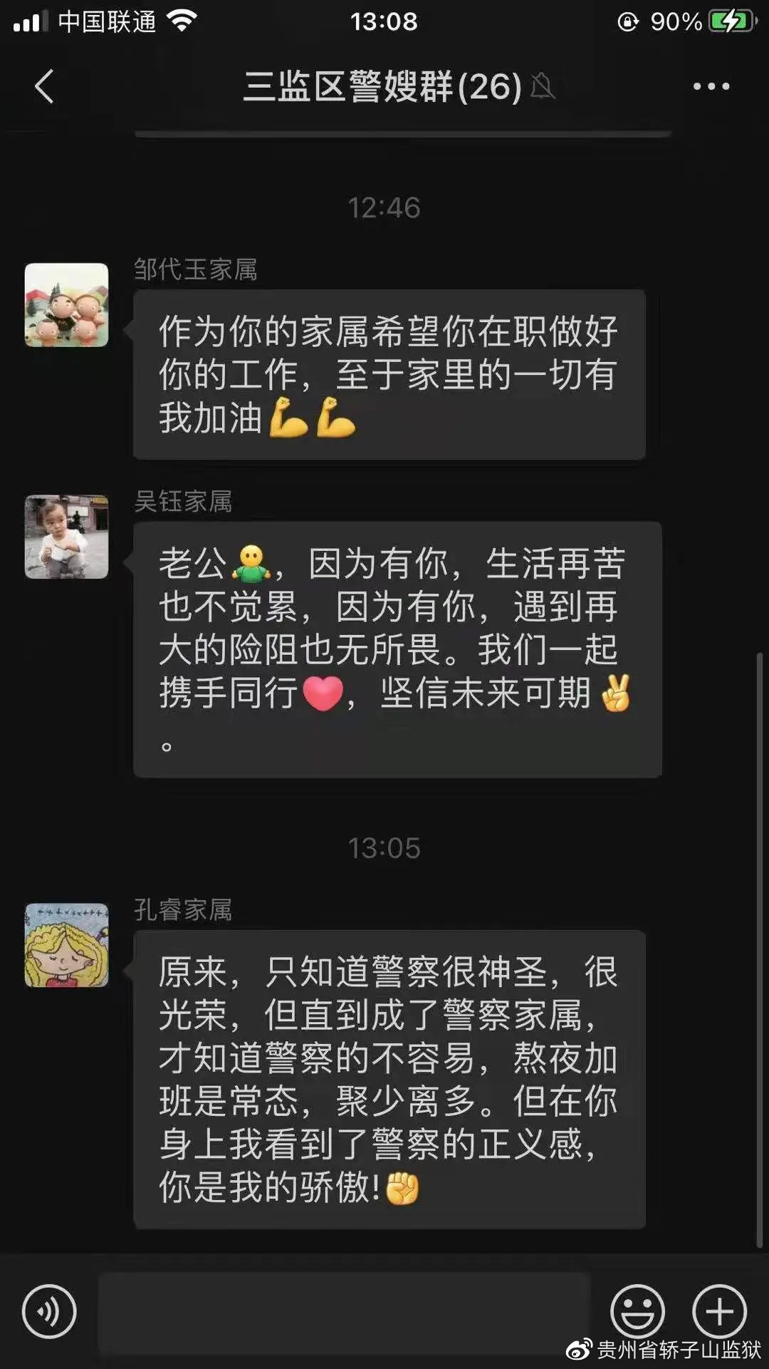 以监区为单位的警嫂群,这几天可谓是热闹非凡。这几天,在警嫂群里,互相鼓励是“秀恩爱”的日常,互相调侃和逗乐是活跃气氛的日常,互相提醒和监督是关心互助的日常。备勤民警将自己生活的点滴、工作的乐趣、坚守的意义分享在微信群里,警嫂们更能体会到民警在工作中讲奉献,在家庭中有担当。