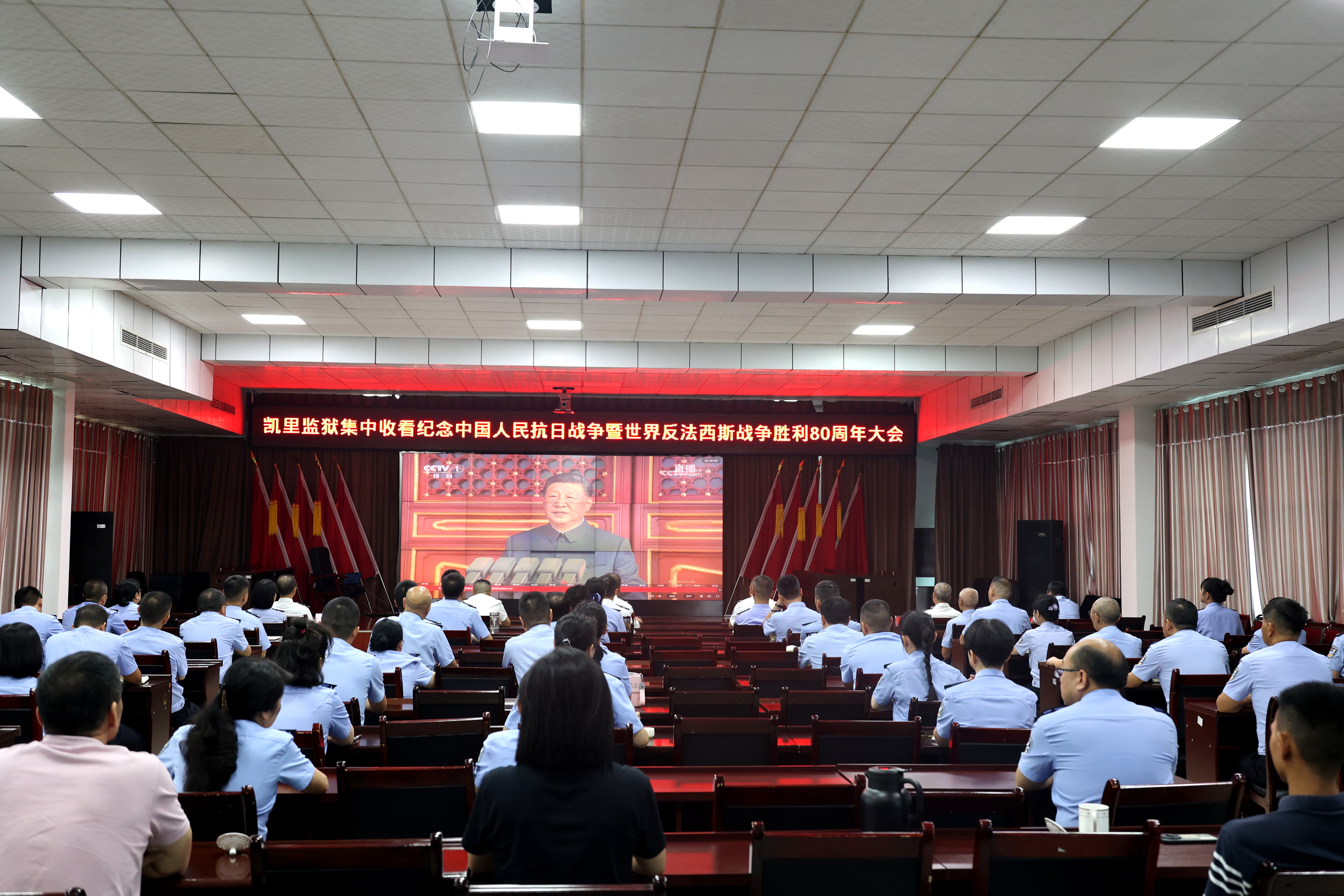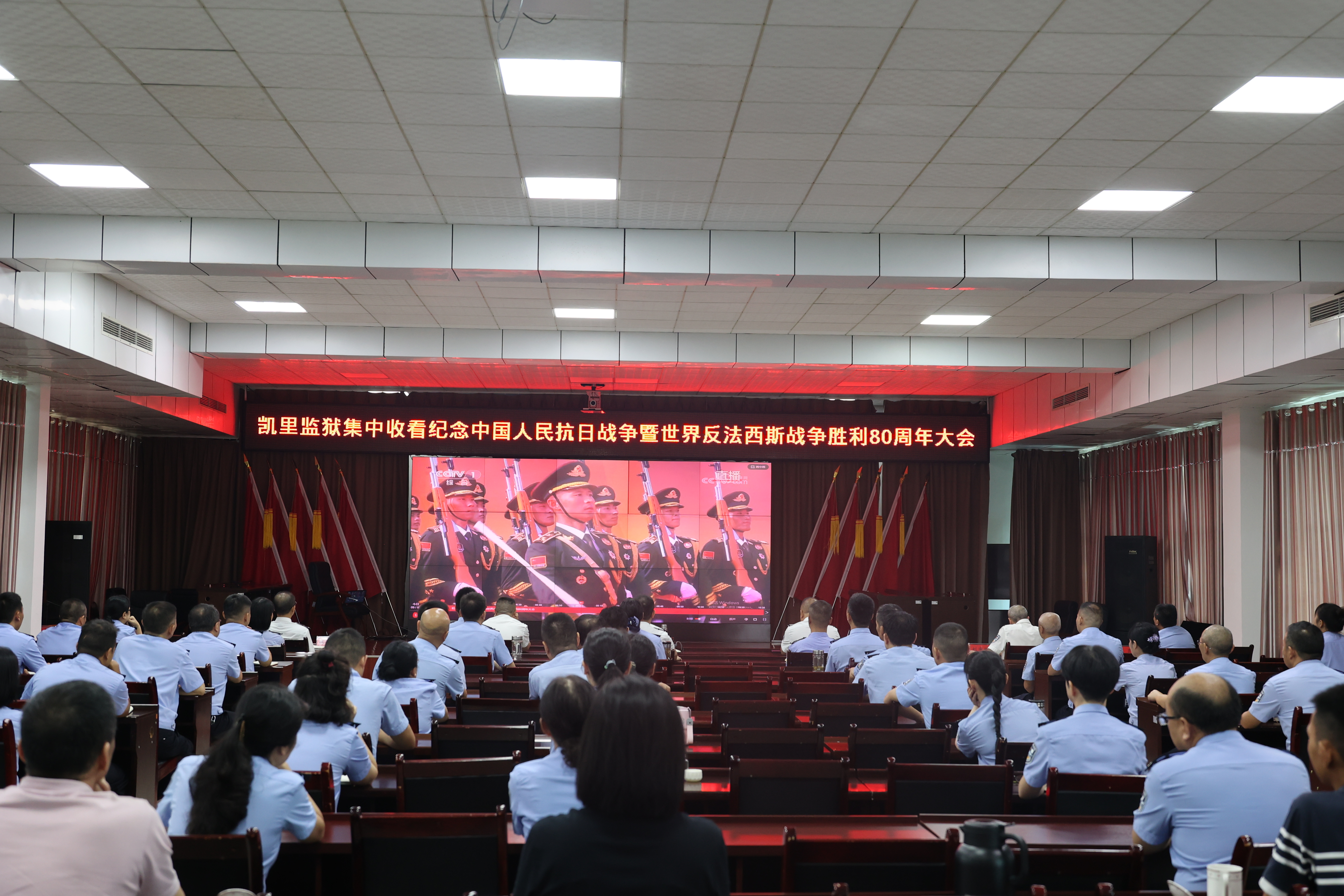 9月3日上午,纪念中国人民抗日战争暨世界反法西斯战争胜利80周年大会在北京天安门广场隆重举行。为弘扬伟大抗战精神,筑牢忠诚警魂,贵州省凯里监狱通过电视直播组织集中收看大会盛况。