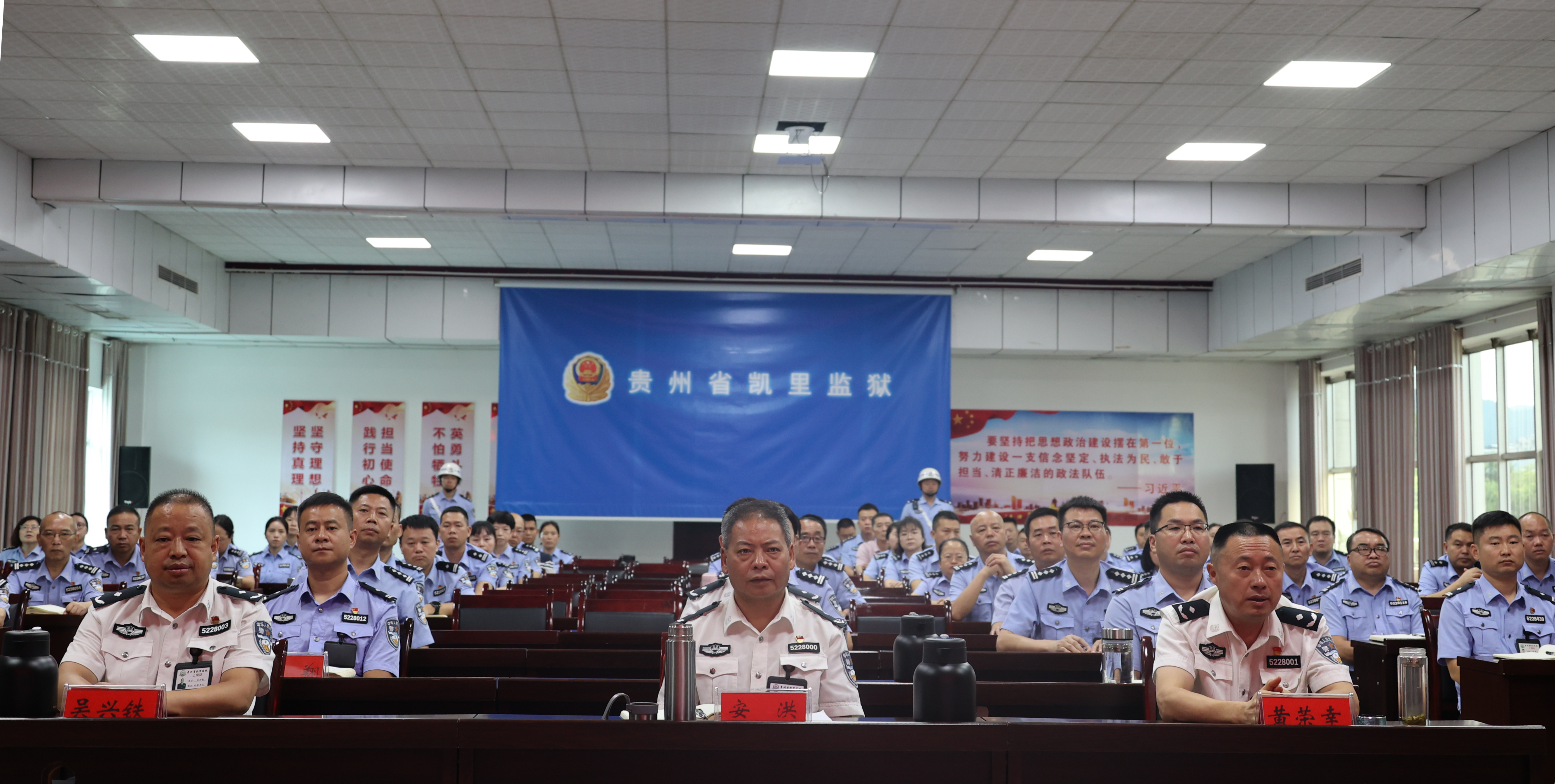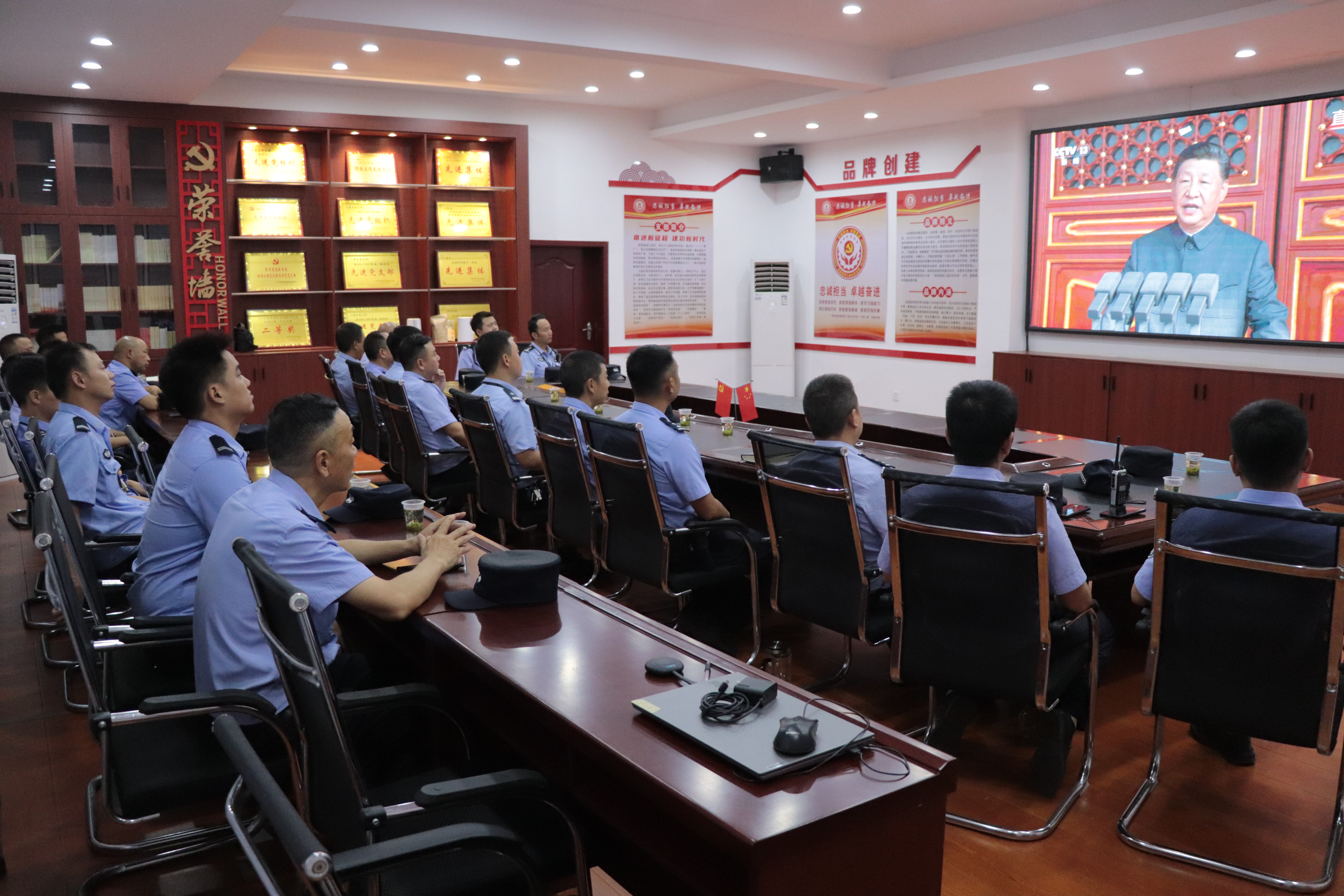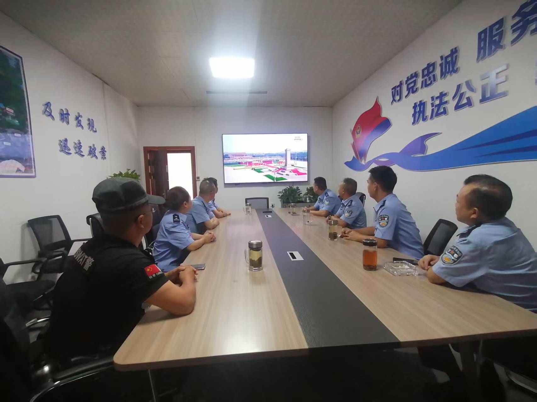 当五星红旗在天安门广场上冉冉升起,伴随着礼炮声出场的国旗护卫队从人民英雄纪念碑缓缓走来。在凯里监狱办公大楼六楼会议室集中观看大会直播的党委班子成员和机关民警神情肃穆,被眼前的壮观场面深深震撼,爱国之情在心中澎湃涌动。