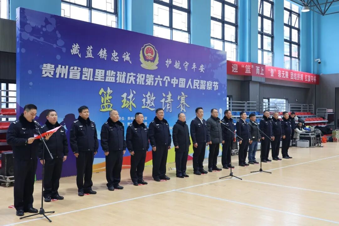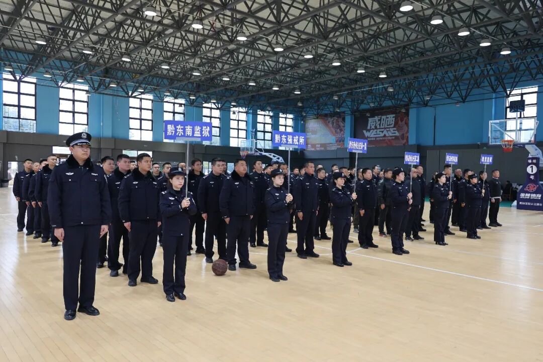 警徽熠熠映初心,热血赛场竞风采。在第六个中国人民警察节即将到来之际,为深入践行习近平总书记重要训词精神,搭建政法系统交流平台,丰富警营文化生活,1月4日下午,以“藏蓝铸忠诚·护航守平安”为主题的贵州省凯里监狱庆祝第六个中国人民警察节篮球邀请赛在黔东南州全民健身中心正式拉开帷幕。 黔东南州人民政府副州长、州公安局局长谢治刚,中共黔东南州委政法委常务副书记王珂,黔东南州公安局、黔东南州司法局、贵州省黔东强制隔离戒毒所、贵州省黔东南监狱、贵州省凯里监狱等单位领导出席开幕式,各参赛单位代表队运动员、裁判员及工作人员齐聚一堂,共同见证这一热血时刻。