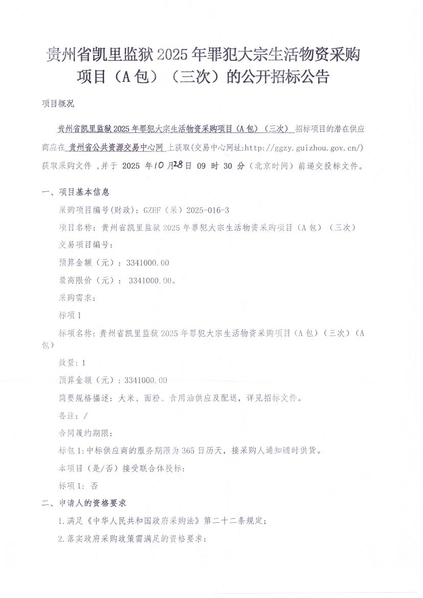 贵州省凯里监狱2025年罪犯大宗生活物资采购项目(A包)(三次)的公开招标公告