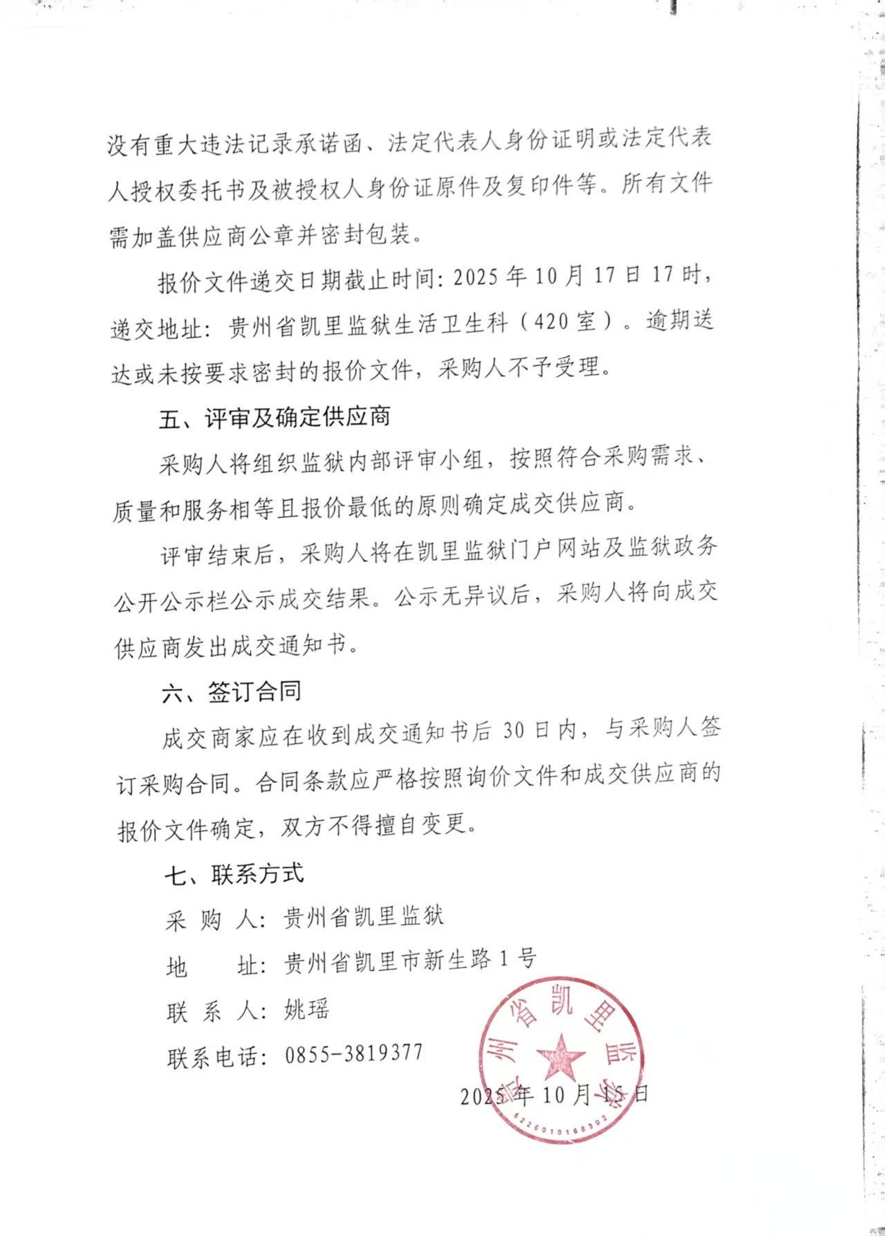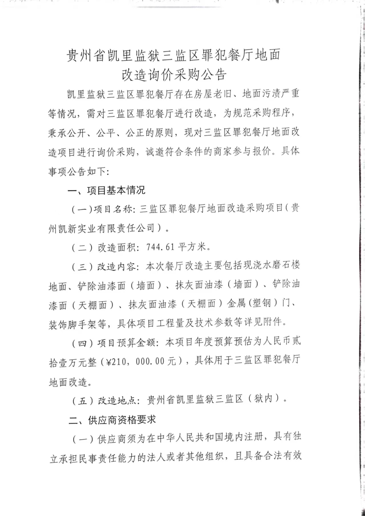 贵州省凯里监狱三监区罪犯餐厅地面改造询价采购公告