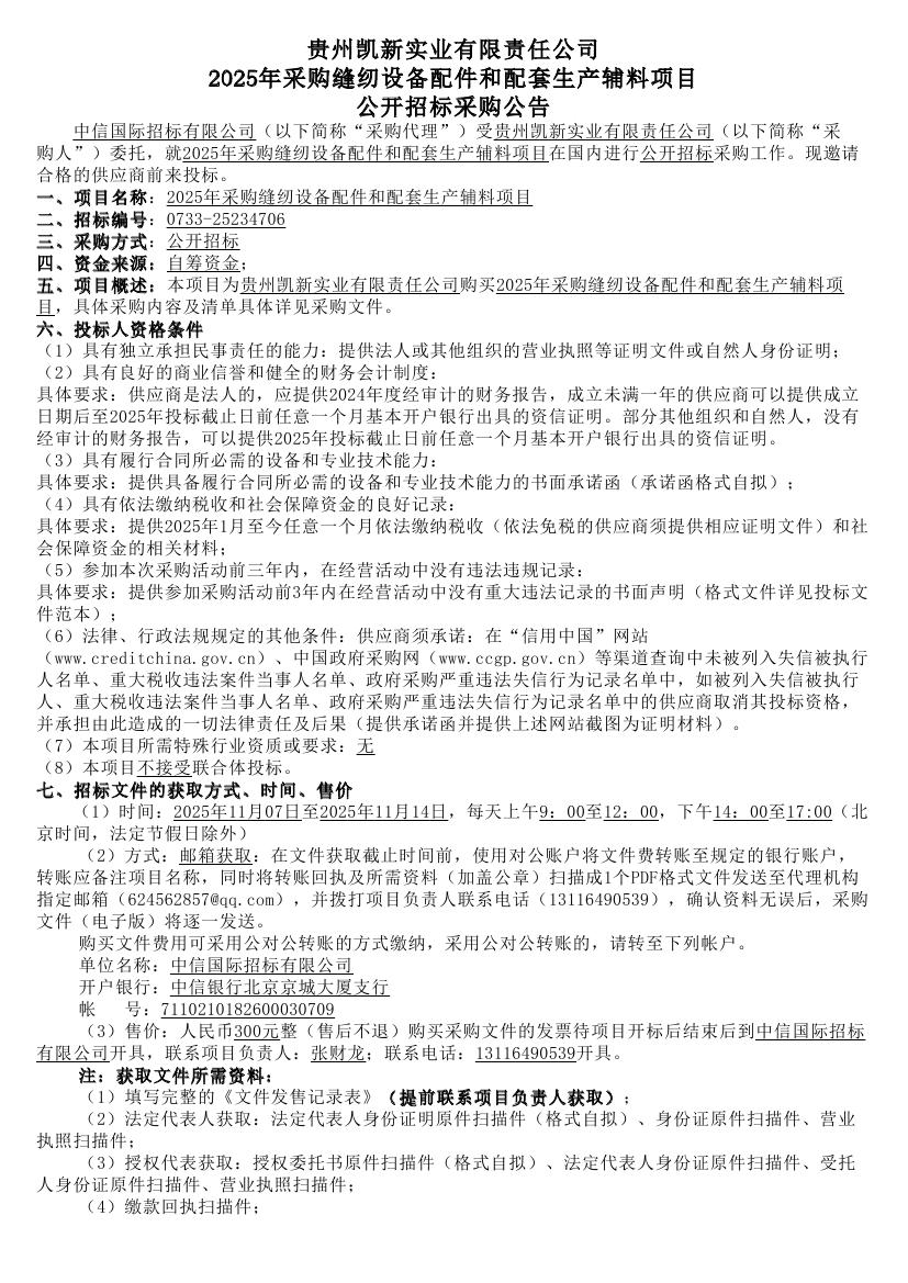 贵州凯新实业有限责任公司2025年采购缝纫设备配件和配套生产辅料项目公开招标采购公告