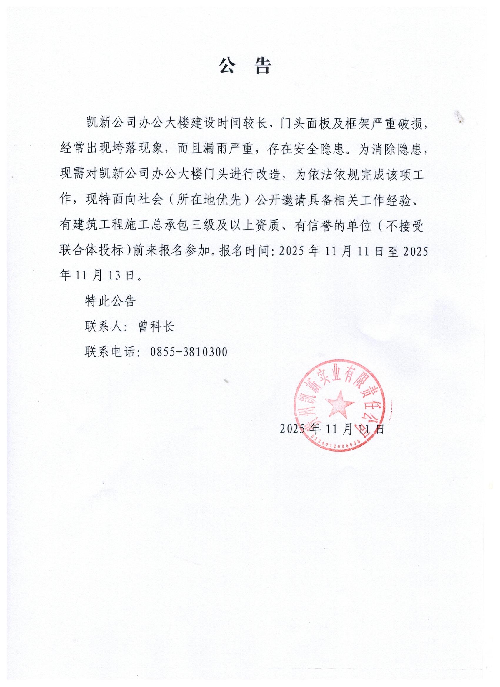 贵州凯新实业有限责任公司办公大楼门头改造公告