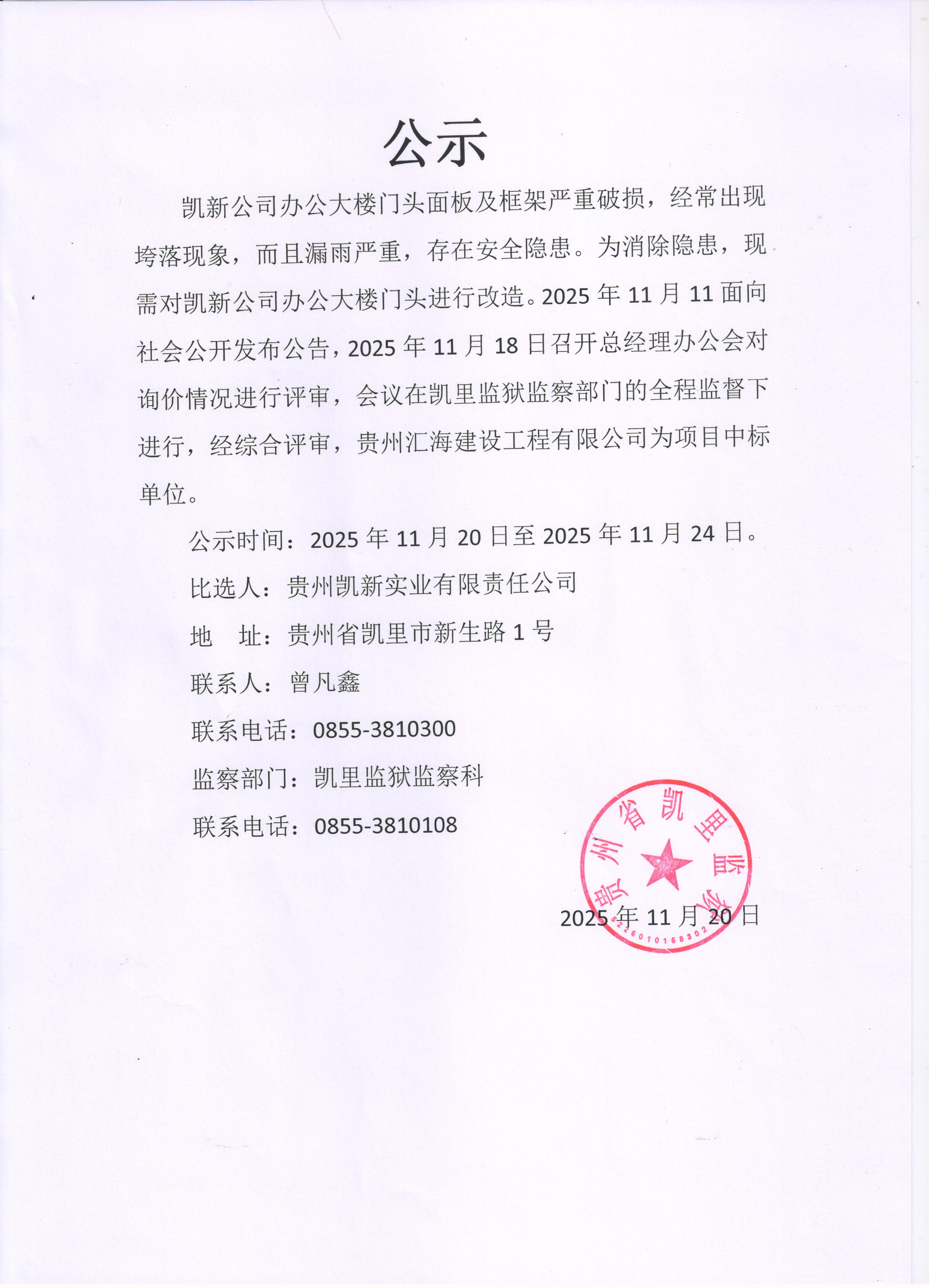 贵州凯新实业有限责任公司办公大楼门头改造中标公告
