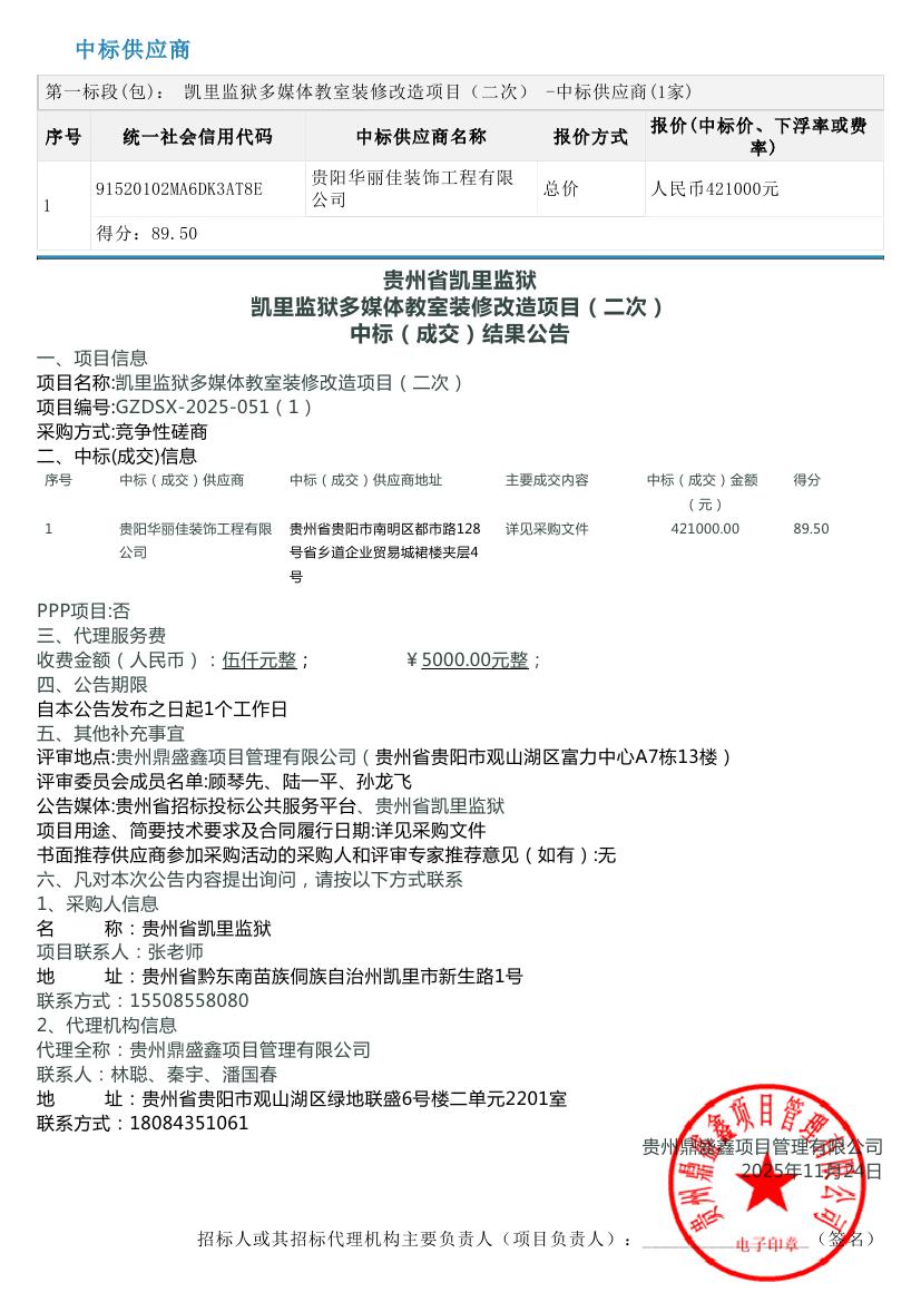 贵州省凯里监狱多媒体教室装修改造项目(二次)中标(成交)结果公告