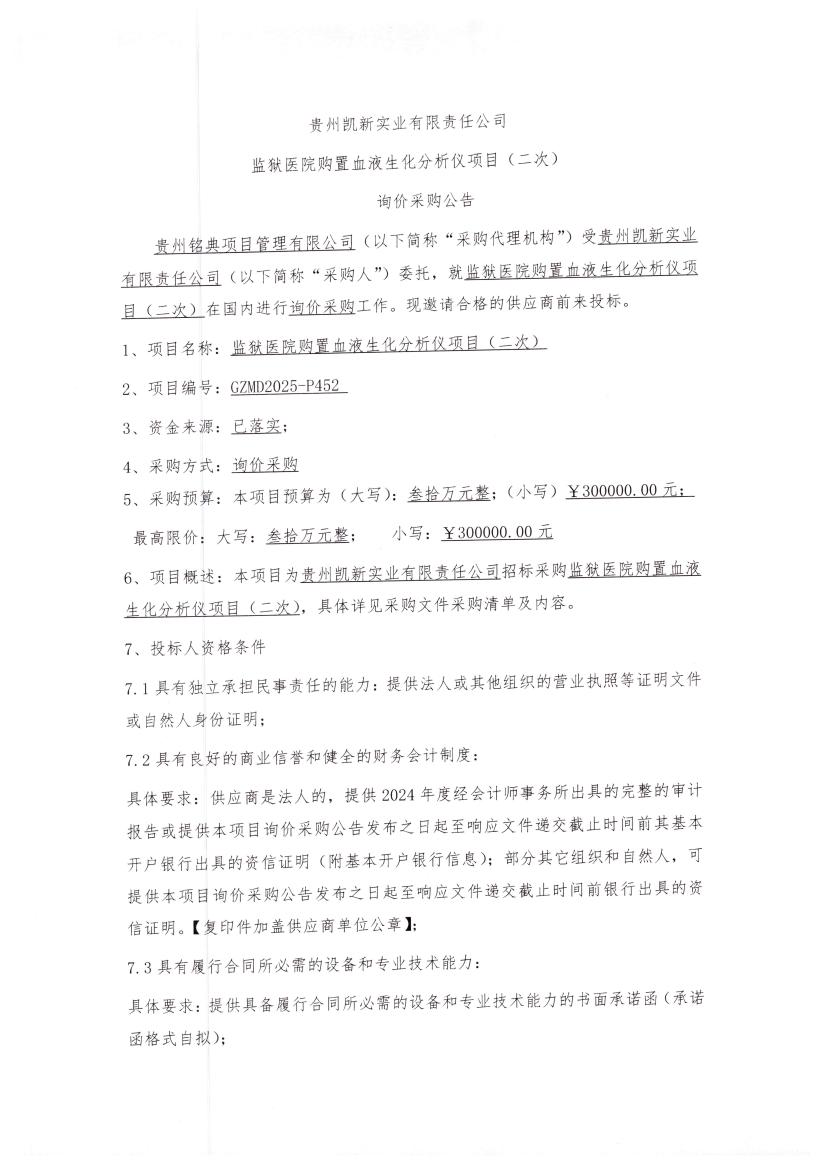 贵州省凯新实业有限责任公司监狱医院购置血液生化分析仪项目(二次)询价采购公告