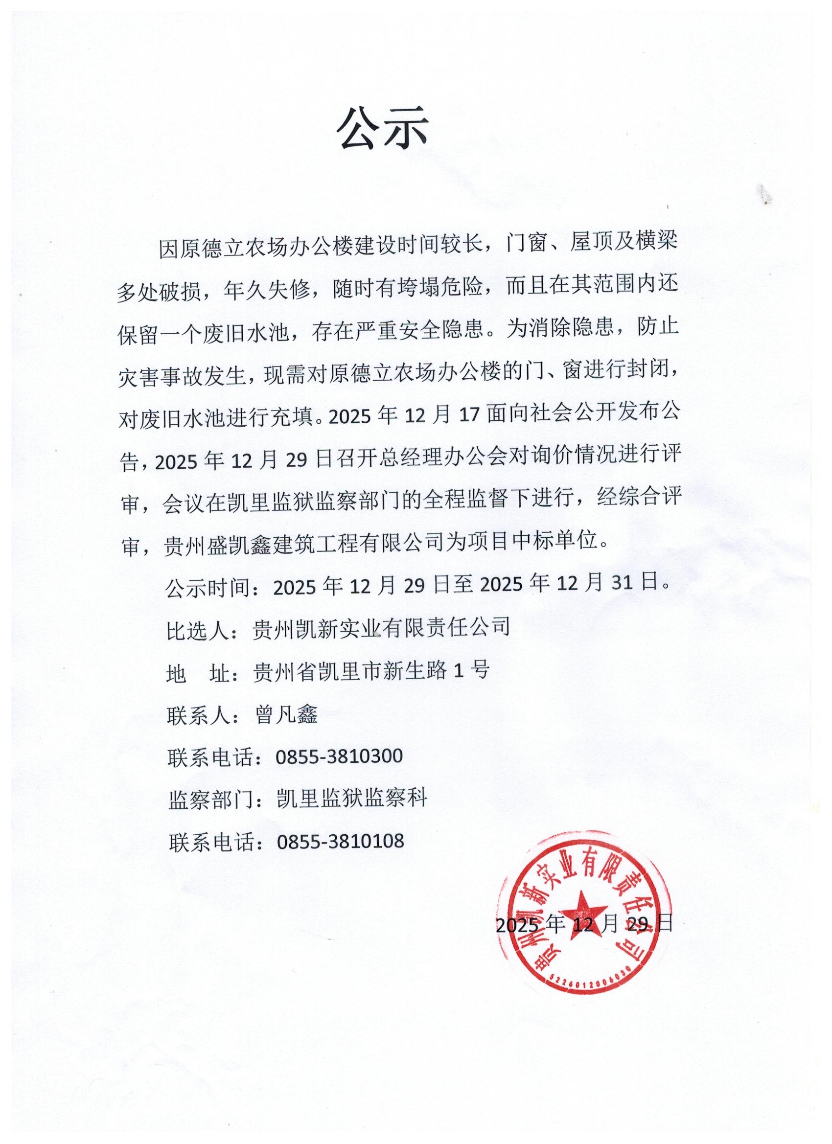 贵州凯新实业有限责任公司安全隐患整治中标公告