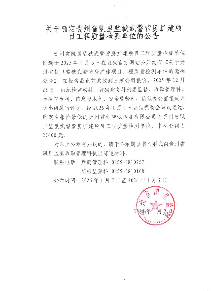 关于确定贵州省凯里监狱武警营房扩建工程质量检测单位的公告