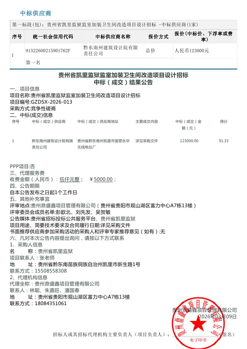 贵州省凯里监狱监室加装卫生间改造项目设计招标中标(成交)结果公告