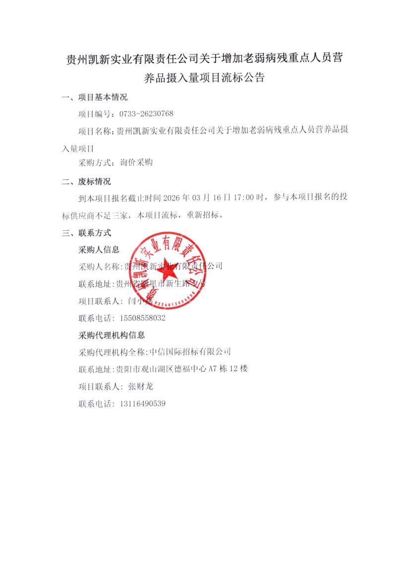 贵州凯新实业有限责任公司关于增加老弱病残重点人员营养品摄入量项目流标公告