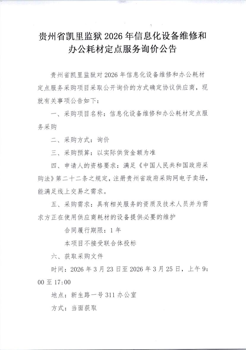 贵州省凯里监狱2026年信息化设备维修和办公耗材定点服务询价公告