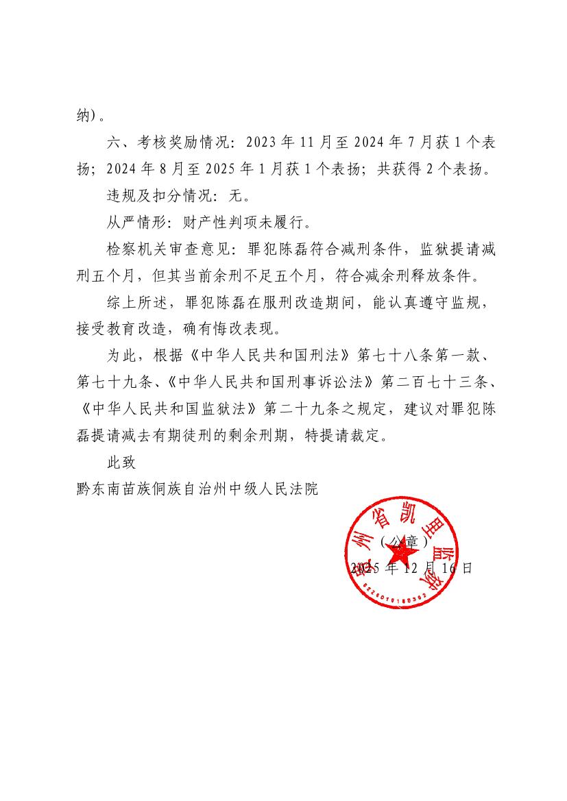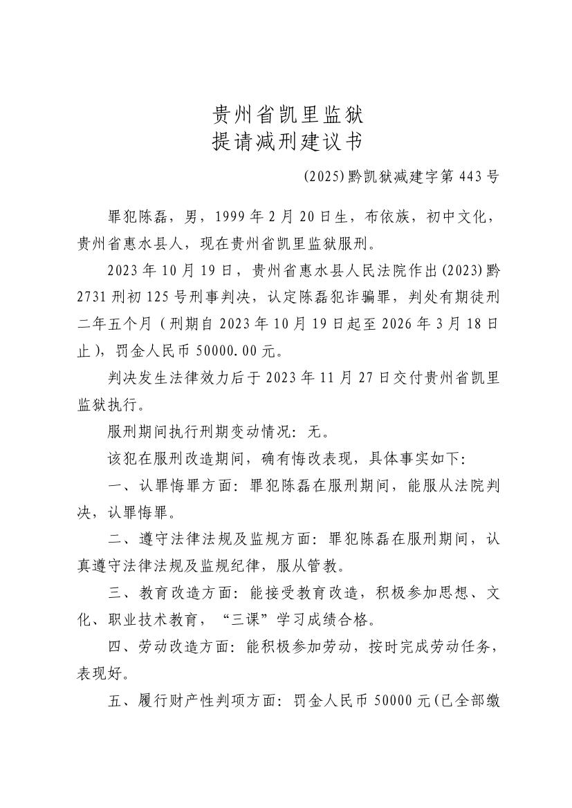 提请减刑建议书(2025)黔凯狱减建字第443号