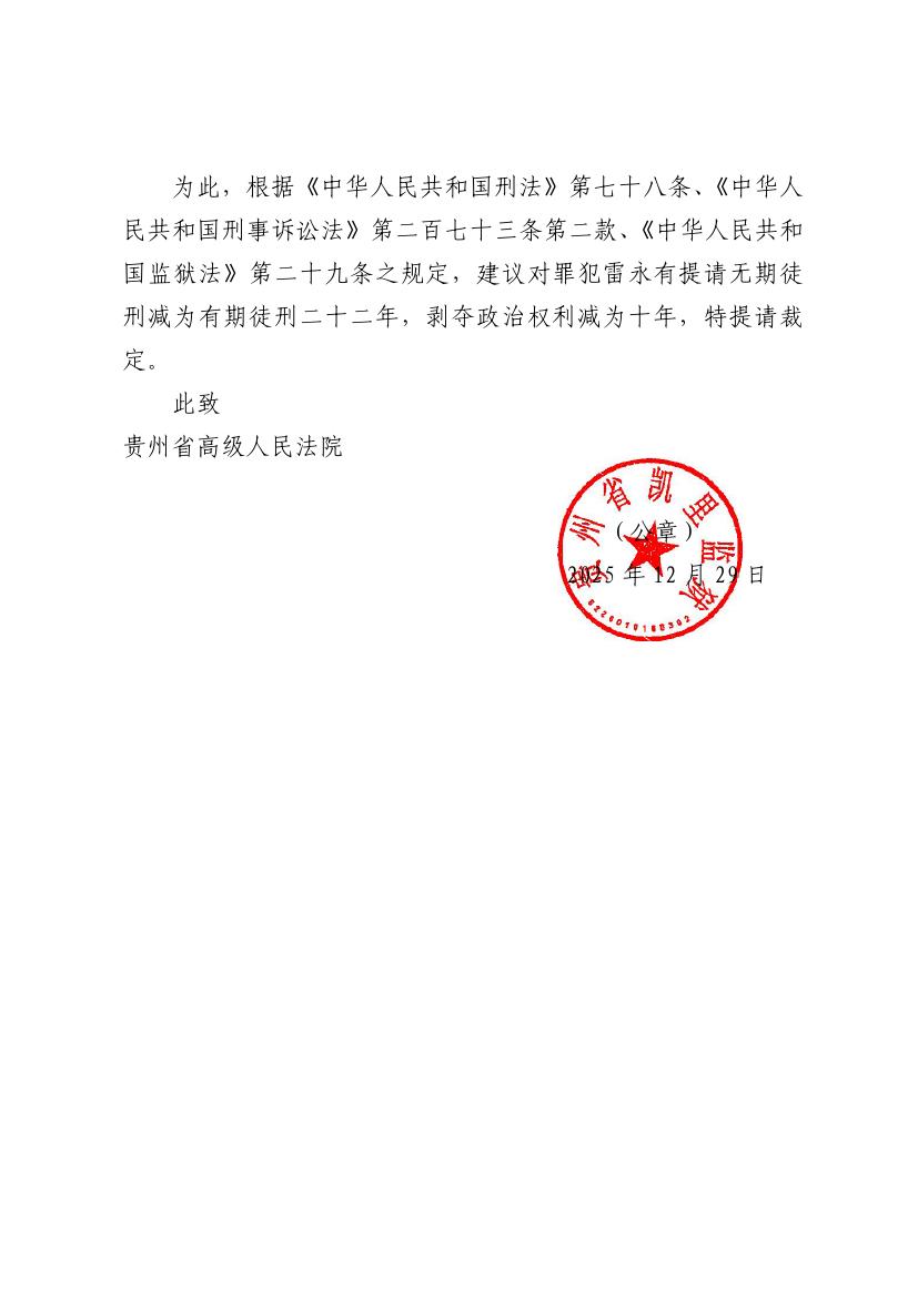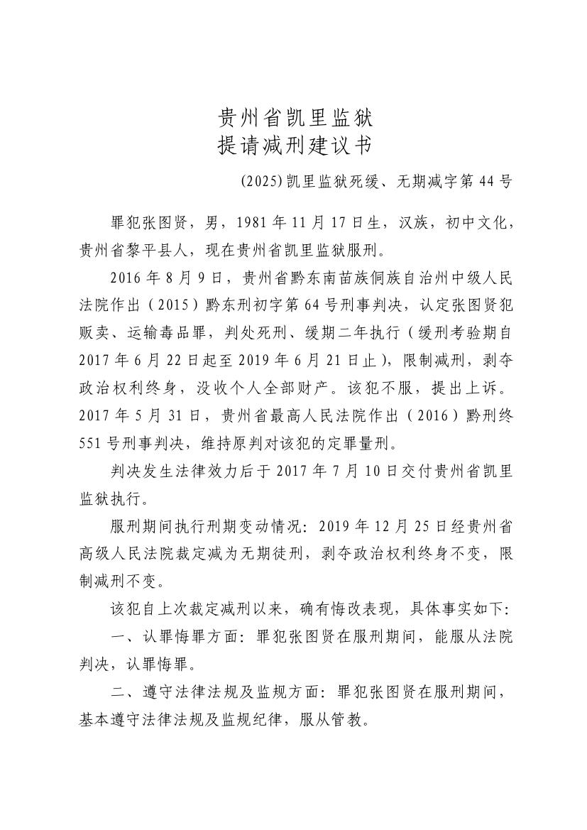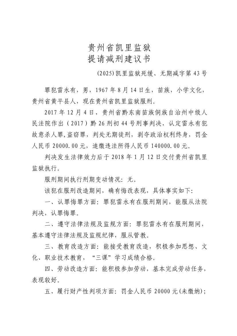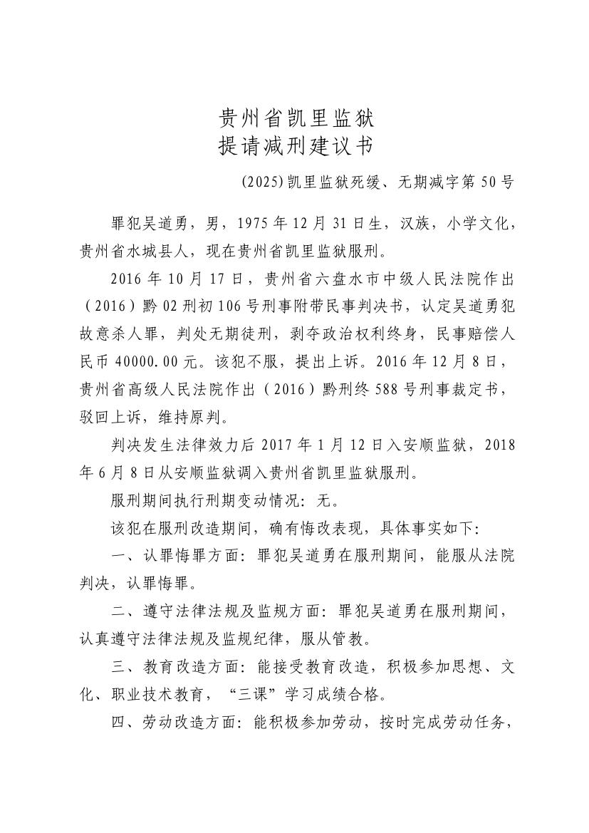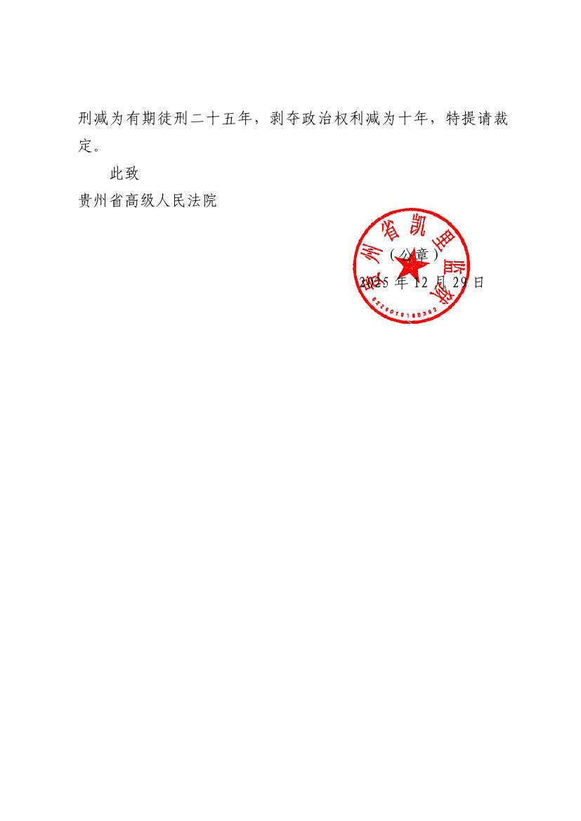 提请减刑建议书(2025)凯里监狱死缓、无期减字第43-50号